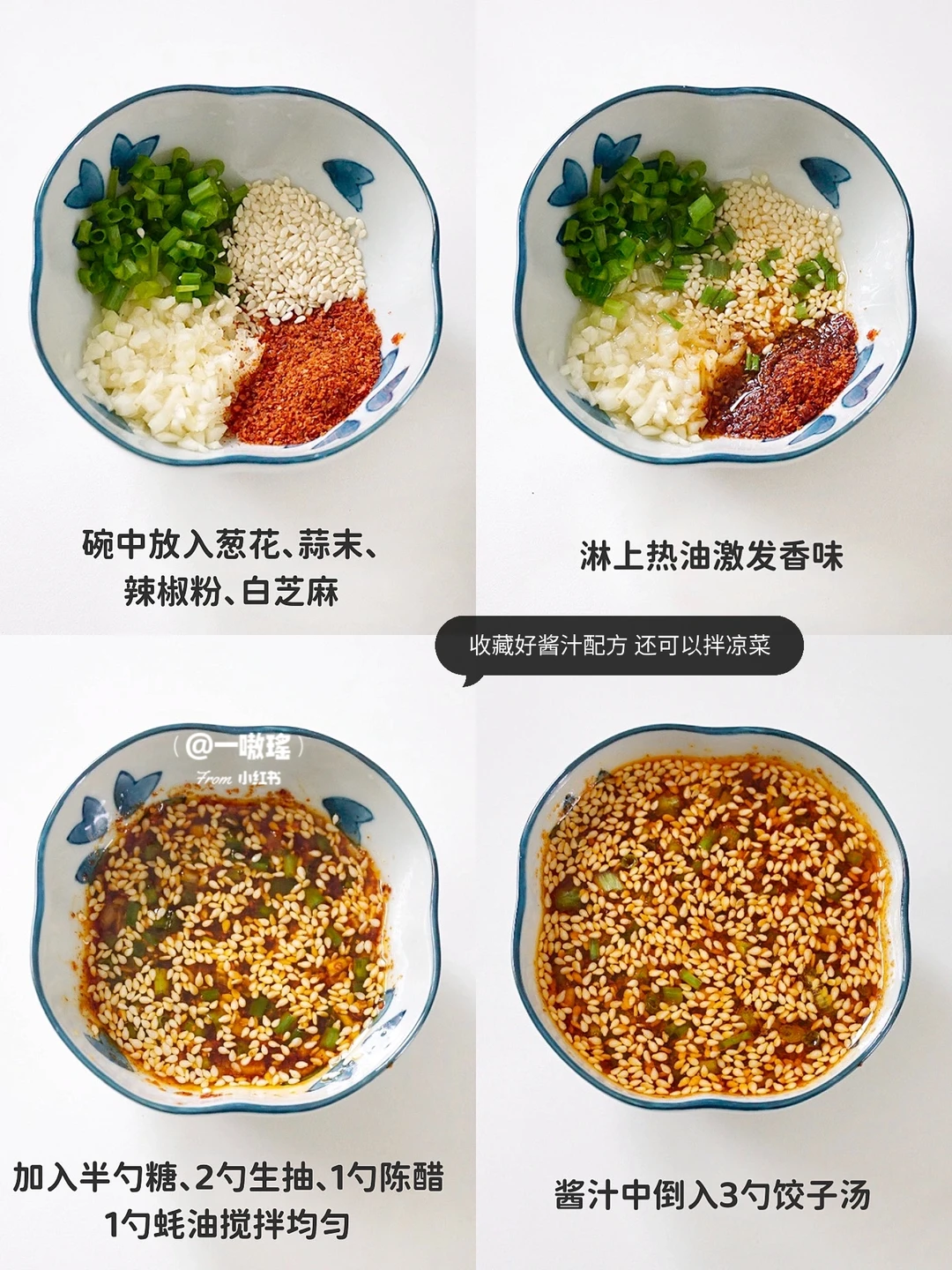 酱汁配方很简单,都是常用的材料,让水煮饺子🥟口味更上一个台阶,层次更加丰富!鲜香麻辣,直呼过瘾 - 自调酱汁配方🔖 ▫️碗中放入葱花、蒜末、辣椒粉、白芝麻 ▫️淋上热油激发香味 ▫️放入半勺糖、2勺生抽、1勺陈醋、1勺蚝油搅拌均匀 ▫️饺子煮熟盛出 ▫️酱汁中倒入3勺饺子汤 ▫️搅匀倒在饺子上即可 - 做法简单,酸辣开胃超满足,好吃又解馋! 酱汁也可以拿来拌凉菜,土豆丝、金针菇啥的