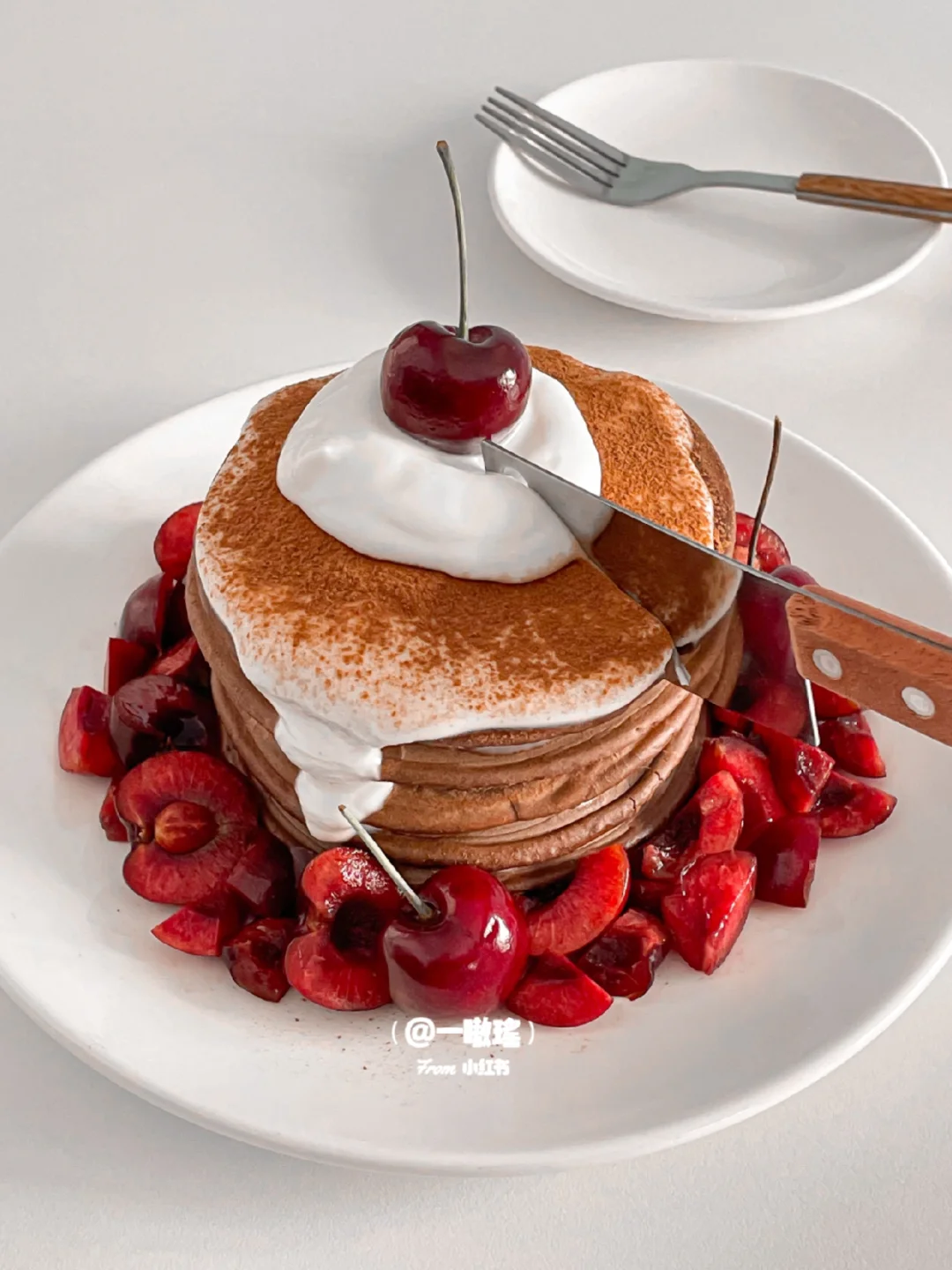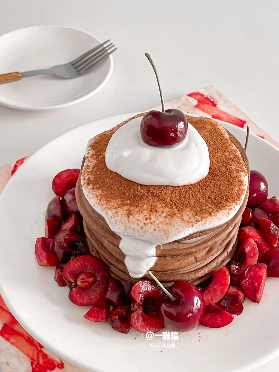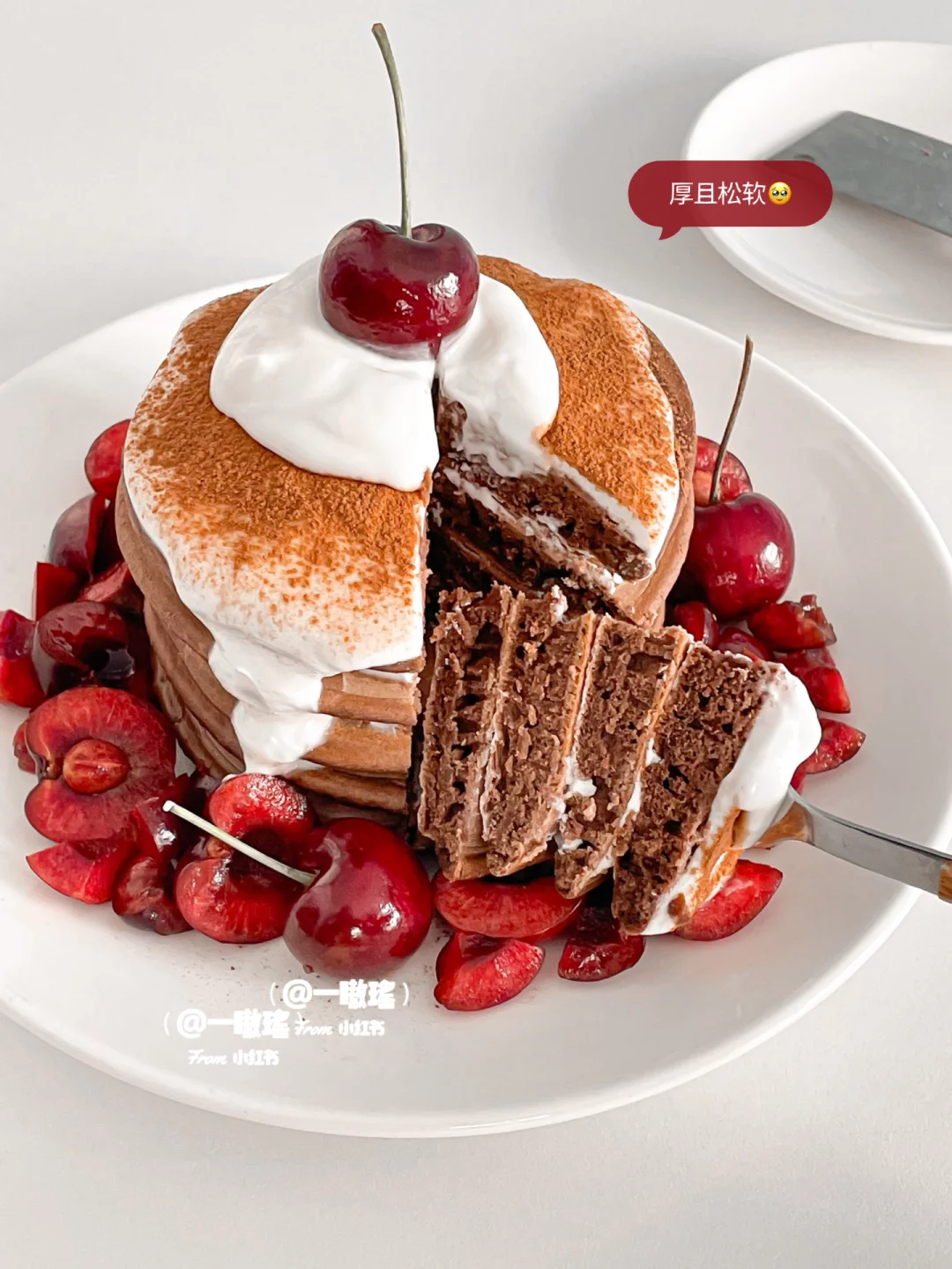 浓郁🍫可可味厚松饼🥞 装饰脆甜车厘子🍒 一口沦陷~
