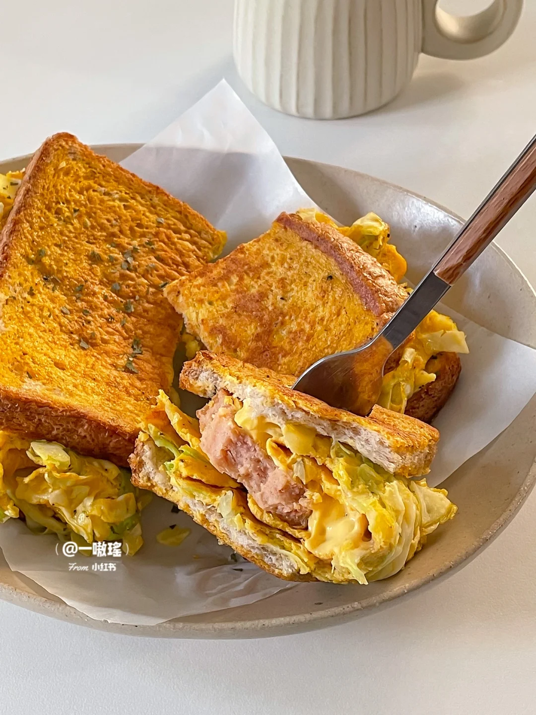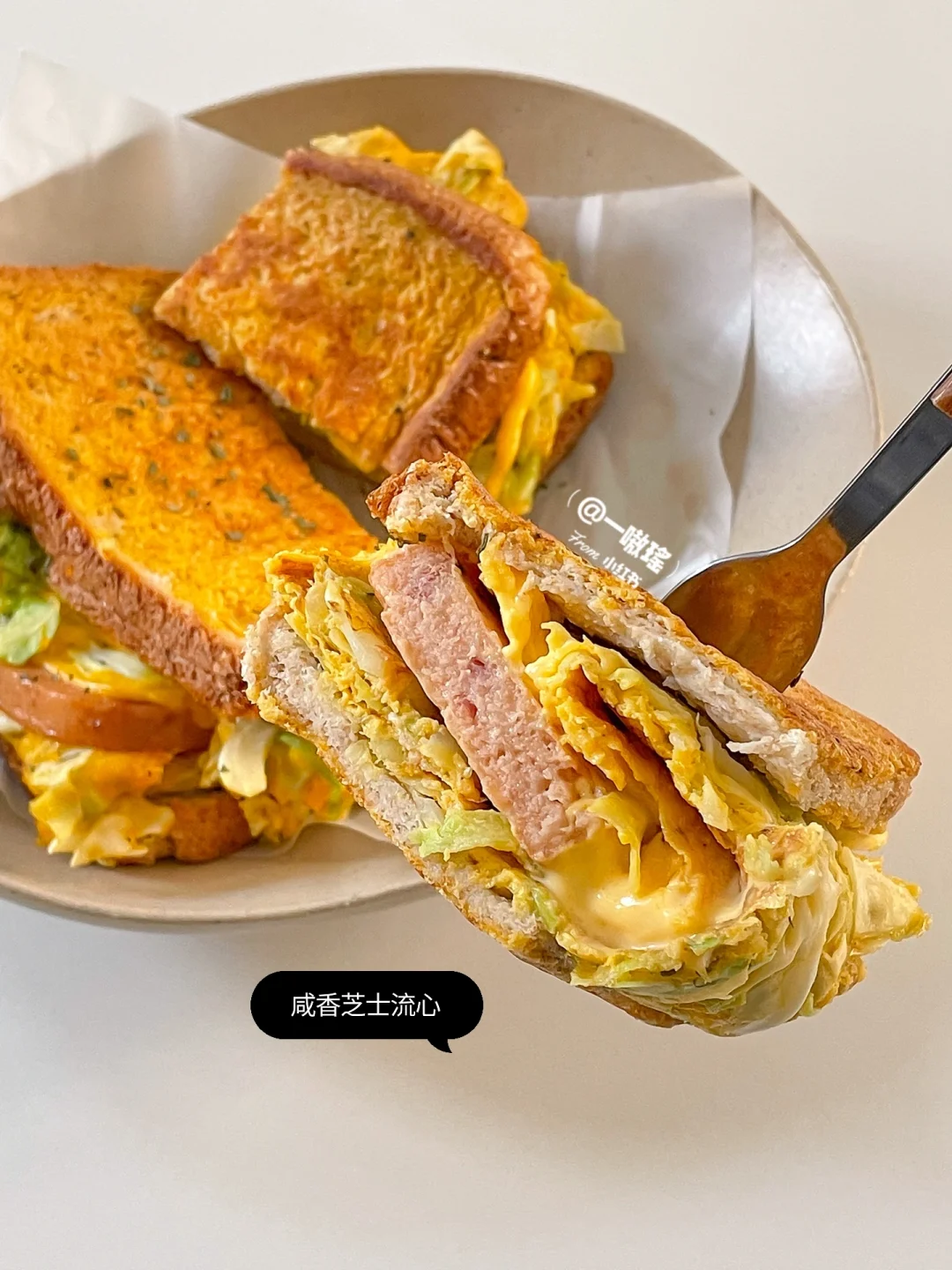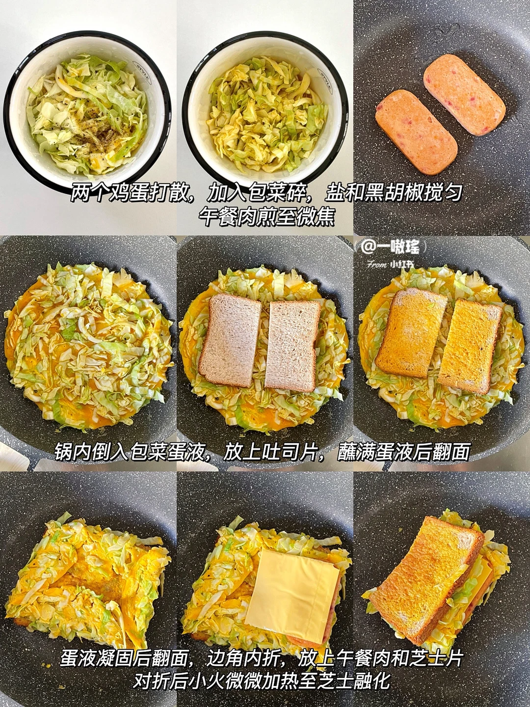 怎么没早点发现这个吃法?! 10分钟就搞定的三明治,太适合天选打工人了💪 吐司吸饱蛋液,煎的外酥里软,还有爆浆芝士夹心 一口下去,口感丰富充盈,营养又美味 - 🛒食材 吐司 包菜 鸡蛋 午餐肉 👩🍳做法 ·两个鸡蛋打散,加入包菜丝,少许盐和黑胡椒搅匀 ·午餐肉提前煎至表皮微焦 ·平底不粘锅少油倒入包菜蛋液 ·吐司片对半切,蘸满蛋液后翻面 ·蛋液凝固后借助盘子整个翻面,边角向内叠 ·放上午餐肉和芝士片,对折后微微加热即可