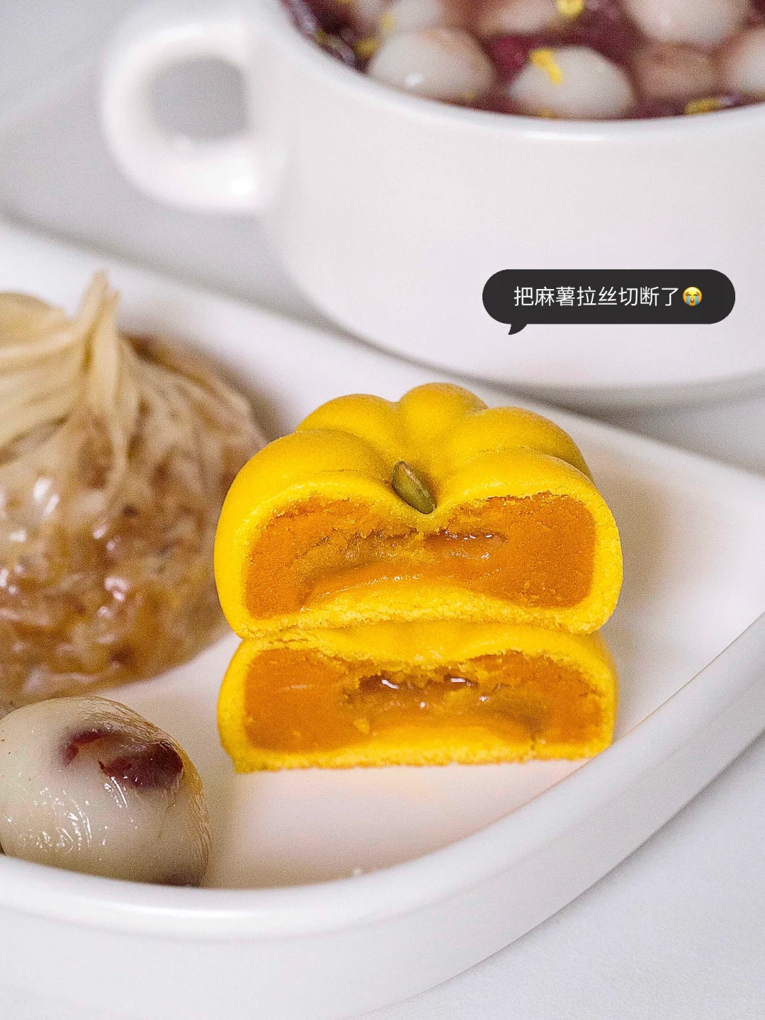♥ Q心南瓜酥:黄澄澄的小南瓜造型太可爱了,内馅是麻薯+蛋黄流心,软糯拉丝