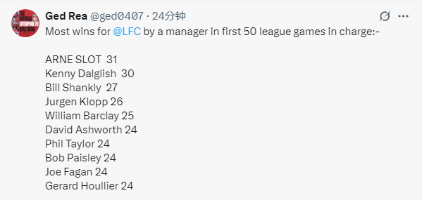 斯洛特是利史上前50场联赛赢球场次最多的主教练