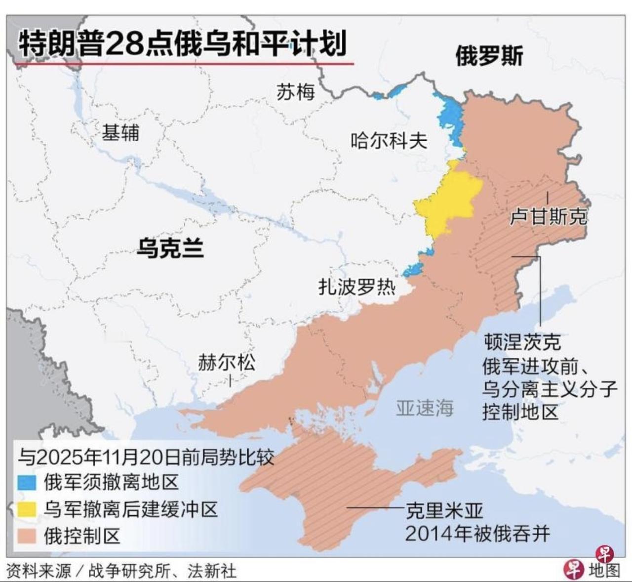 美和平方案:乌失大片土地 俄获“三个新加坡” 方案要求乌克兰放弃其目前仍控制的顿涅茨克州等大片领土,以换取俄罗斯归还哈尔科夫州等地的部分土地。最终结果是乌克兰将失去约20%的领土,而俄罗斯净获利约2300平方公里,约等于三个新加坡面积。 方案要求乌克兰在100天内举行选举,并承认克里米亚等地为俄罗斯领土。 分析指出,此方案内容与俄方2022年提出的要求相似,对乌克兰极为不利。 据悉,未来几天,乌克兰与美国将在瑞士启动会谈讨论和平协议框架。