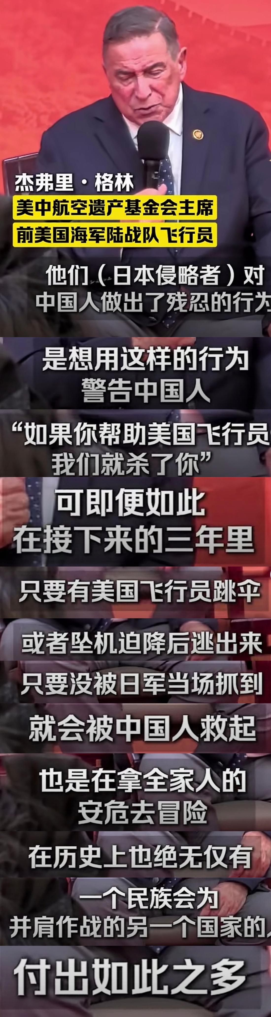 前美国飞虎队成员“杰弗里.格林”公开表诉:感恩中国人以命相救! 他说:“二战时期,日本人相当残忍。那时曾警告中国人,如果谁要是帮助美国飞行员,就杀了你!他们以为这样说起到震慑作用,会让中国人害怕,可接下来的几年,只要有美国飞行员跳伞,或者坠机迫降逃出来,只要没有被日军当场抓住,就会被勇敢的中国人救起。” 他话语中充满感激之情,哽咽了片刻又继续说:“那些施以援手的中国人心里非常清楚这意味这着什么。他们不仅是在为一个素未谋面是陌生人拼命,也是在拿全家人的安危去冒险。他们的妻儿老小都有可能因此而丧命。” 杰弗里.格林感慨:“这是件非常了不起的事,在历史上也绝无仅有!一个善良的民族会为并肩战斗的另一个国家的人付出如此之多,这是我与中国人民之间的深厚友谊,感恩!” 真是没想到,这种生死情谊,直到今天还有美国人没有忘,即便是相隔了80年,但依然滚烫!