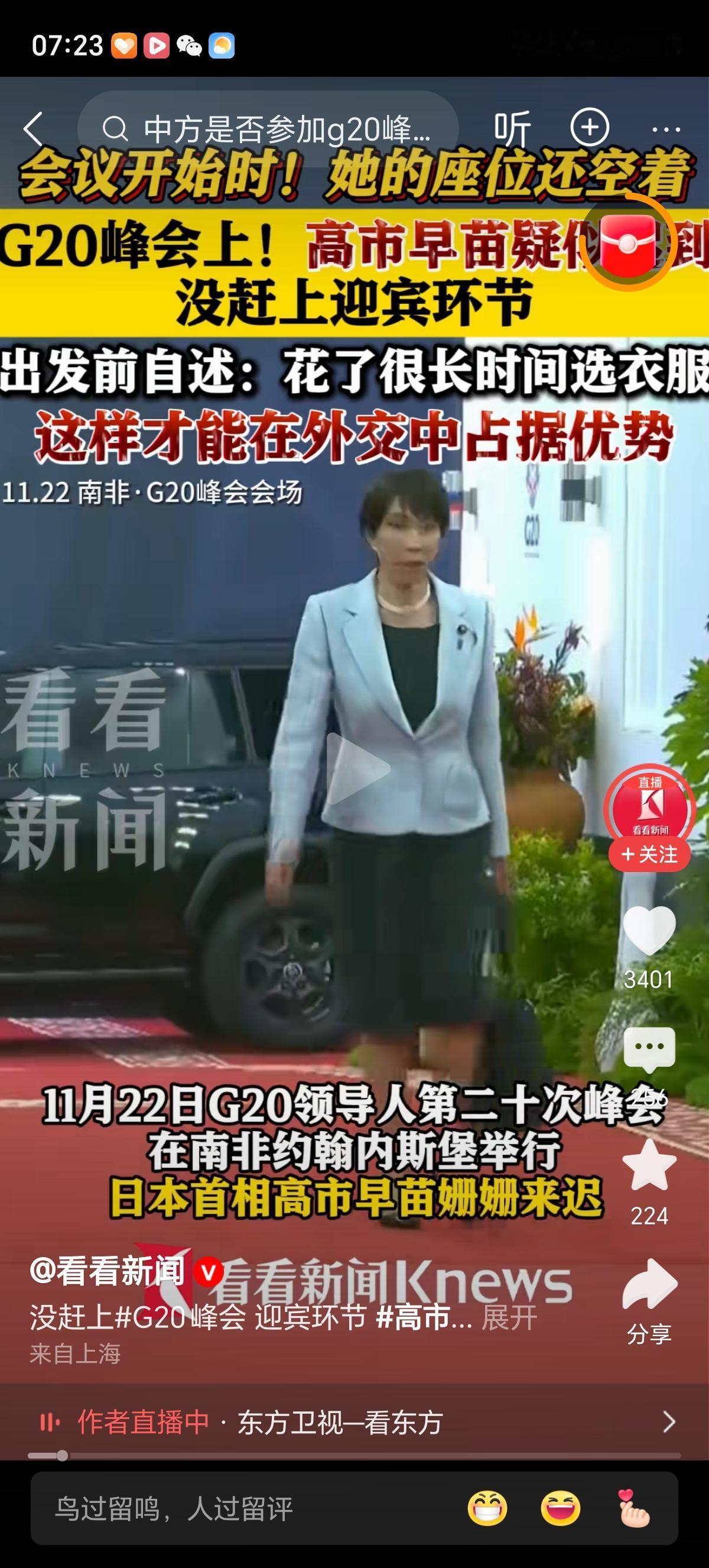 她应该不是一些人说的“比起处理国家大事,更关心穿衣打扮”,这是压轴出场的方式分明是一种提高个人气场,更好谈判的手段。 其实高市早苗这次来G20本就带着一堆棘手的外交麻烦。之前她发表关于“台湾有事”的不当言论,直接惹得中方强烈不满,G20期间的双边会晤直接被拒绝了。更尴尬的是,她上任还不到一个月,已经因为各种言论招来了中、俄、朝、韩四国的批评,本来想借着峰会挽回点外交颜面,结果这下彻底弄巧成拙。