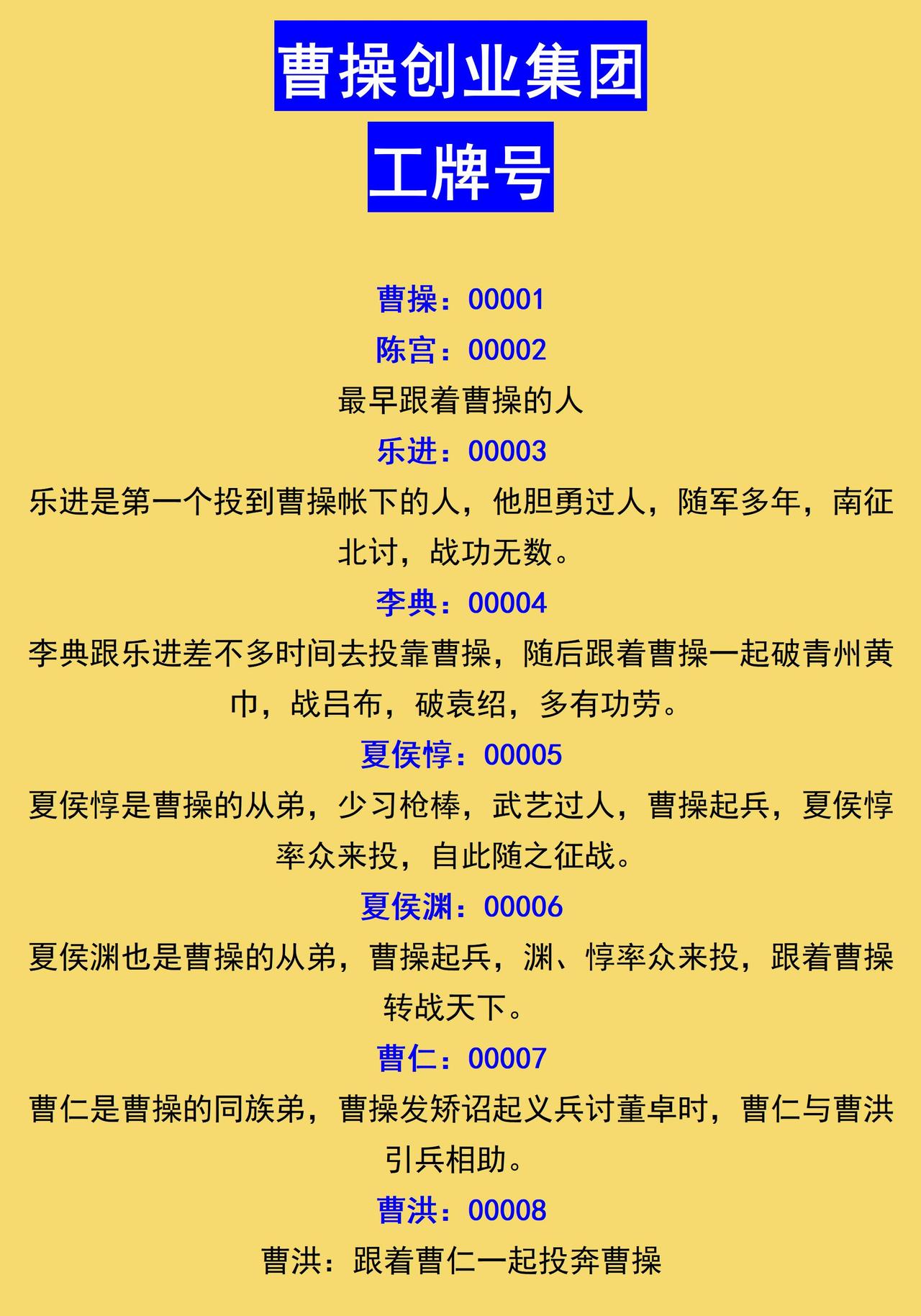 曹操创业团队“工牌号”。 谁最应该是2号员工? 2号员工意味着是最早跟随曹操创业的。 显然应该是陈宫,不过陈宫最早投奔曹操是演义中的故事,真实的情况可能并非如此。 真实的情况可能就是曹操的老家的那些人合作创业,其核心人物也是曹操老家亳州的那批人。