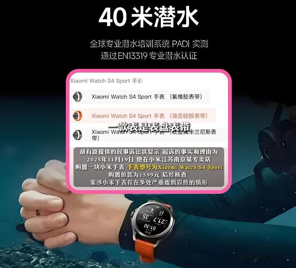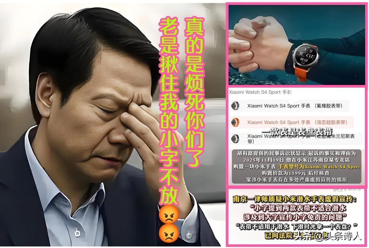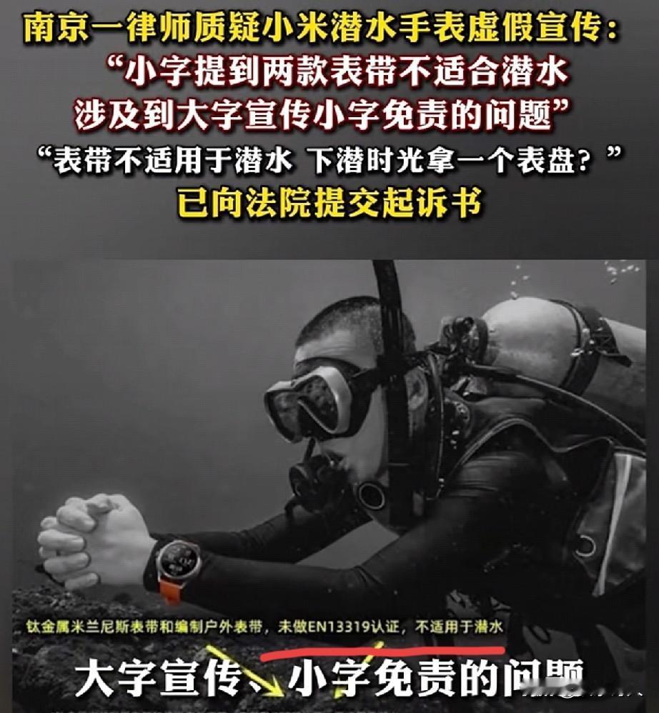网友戴【小米潜水表】潜水,手表进水 客服→“表带不适用于潜水,潜水表不建议潜水用” 律师→虚假宣传,决定起诉小米 南京一律师质疑品牌方潜水表涉嫌“大字宣传,小字免责”问题,存在虚假宣传、主观欺诈故意并且实施隐瞒真实情况的行为,决定送给品牌方公司一纸传票,已提交相关诉讼材料。 网友炸锅了→ 🔸潜水表表带不是用于潜水,小米不适用于食用; 🔸潜水手表的表带不适合潜水,汽车的电池不适合上路[强] 🔸玩文字游戏是粗粮的专属; …… 面对网友的质疑,小米公关也出来说话了→ 🔹客服回复存在“表达不尽严谨”,深表歉意; 🔹表带不适合潜水,表带有多种: —氟橡胶和液态硅胶表带与表盘适合潜水; —钛金属米兰尼斯表带和编织户外表带不适合 该说不说,雷总今年的“雷”是一波接一波,根本接不完呀😂 ⚠️雷总的“小字雷”,也给各企业提了个醒,以后做宣传,把该提醒的注意Tips写得醒目一点,避免一些不必要的质疑! (信息来源:澎湃新闻)