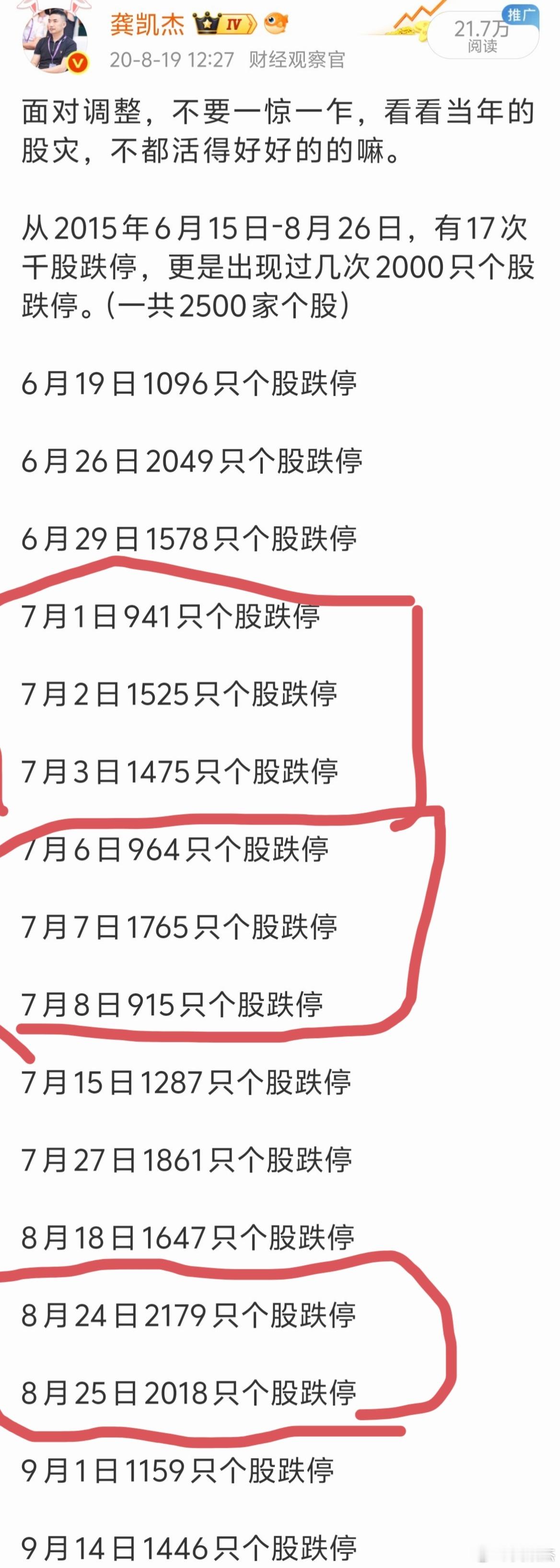 现在的市场真的成熟了不少,许多漏洞都堵住了,千股跌停板也很少上演了,以前可以连续三天跌停板,想想都后怕,但扛过去了,回头看看也就输时间!(期间大起大落,也有多次千股涨停板。)