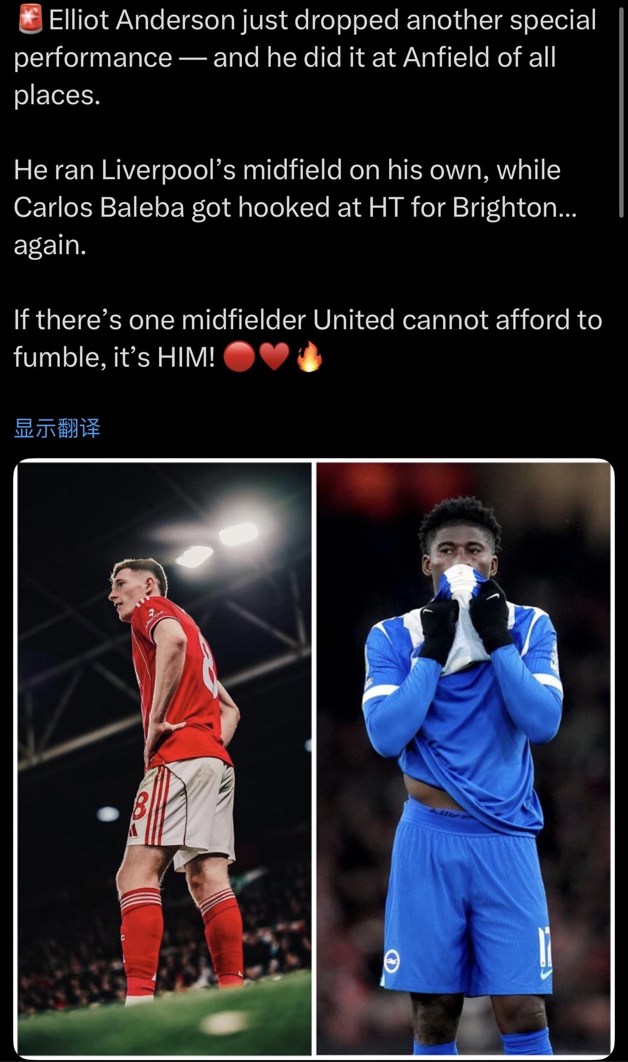 其实我不太同意这下面这个帖子的,因为我看了利物浦对森林的比赛,安德森在上半场在后场被断球2次,都是非常危险的区域。要不是萨拉赫和整个利物浦状态太差,估计森林不会那么好过。 至于巴莱巴,海鸥中场人员多,不怕他状态差,但至于他这种情况,为什么还能首发? 这就是很有意思的点了,到底是海鸥为了保持他身价,不得不让他首发呢?还是他自己在摆烂? ……………………………………………………………… 埃利奥特·安德森又一次奉献了精彩的表演——而且他是在安菲尔德球场做到的。 他一人扛起了利物浦的中场大旗,而卡洛斯·巴莱巴在半场就被布莱顿换下……又一次。 如果说曼联最不能放过哪个中场球员,那就是他!