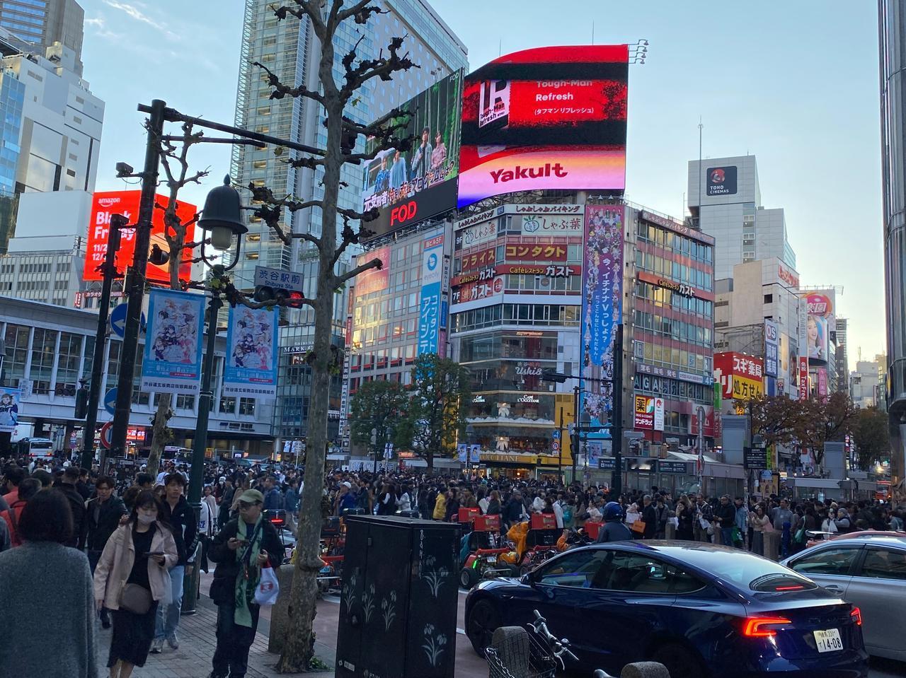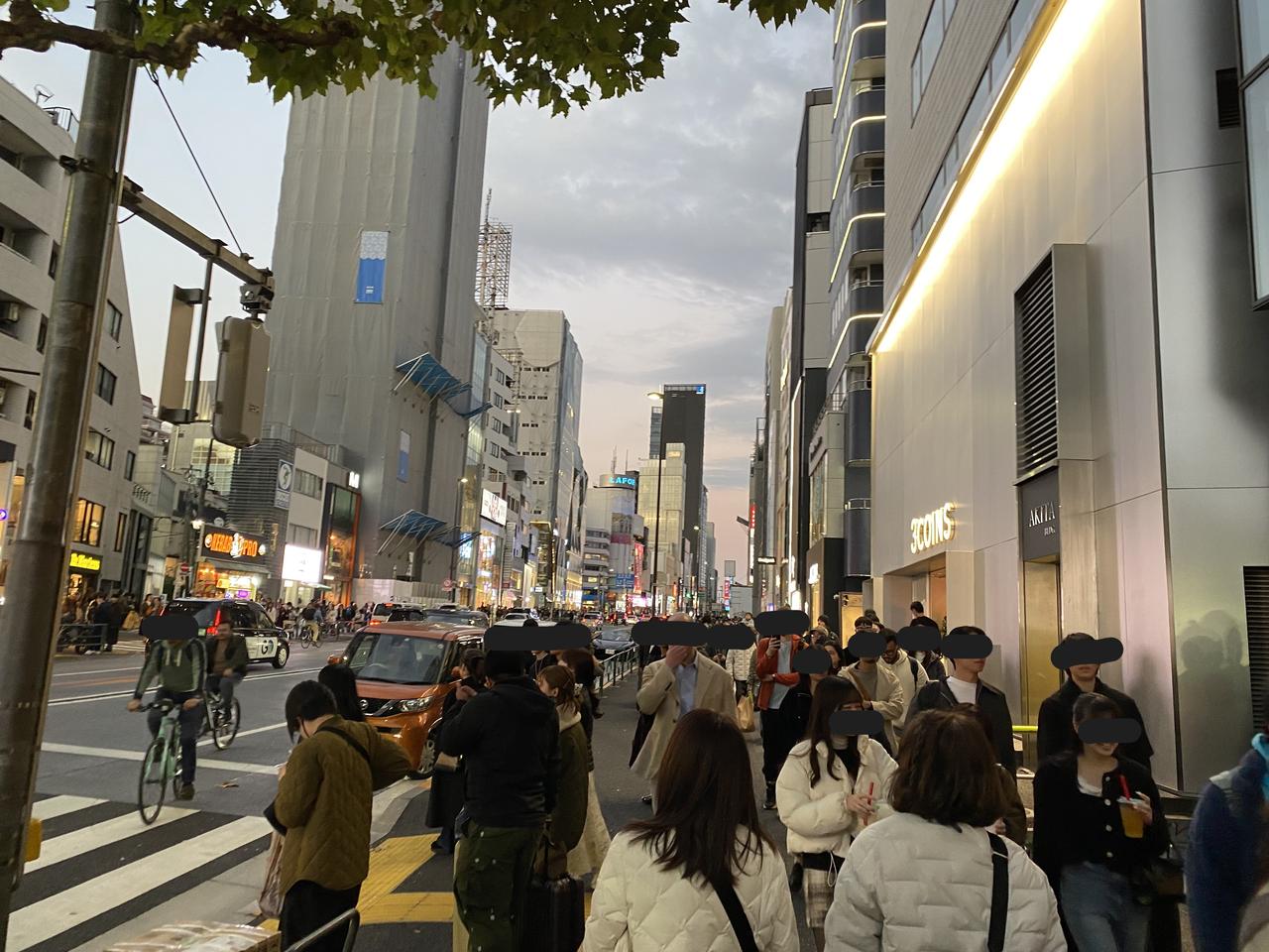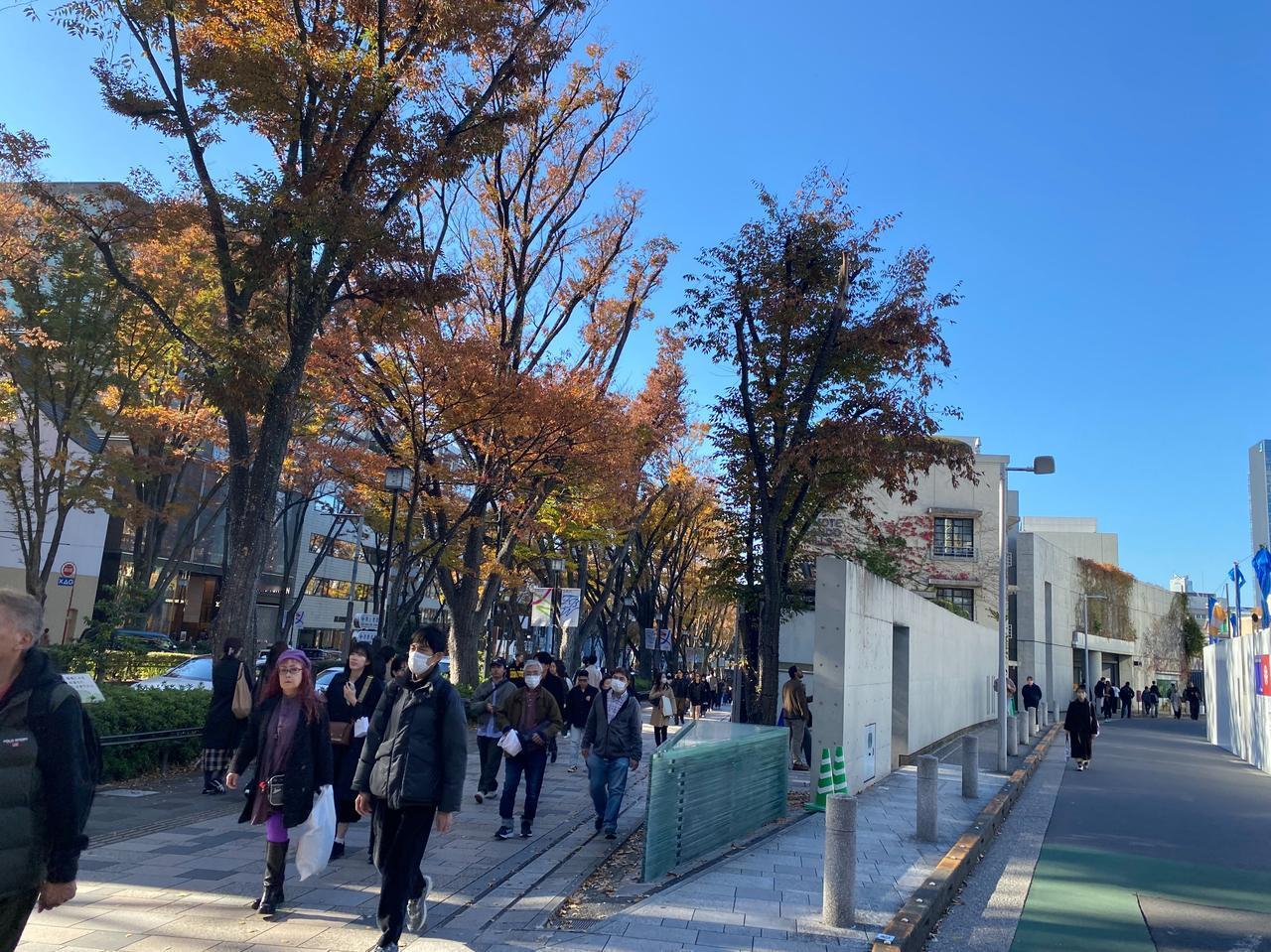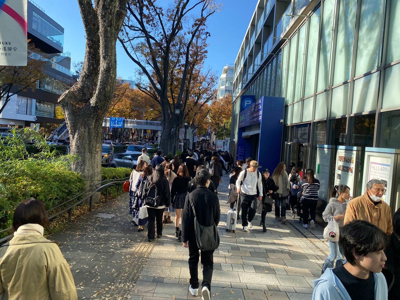 昨天11月22日(周六)是日本三连休的第一天,又是个好天气。印象里的东京表参道的树木一直有点像上海的衡山路,就直奔表参道了[呲牙] 地铁表参道A3出口出来就是Tiffany的店,正值午餐时间,就在旁边的轻食店解决午饭[微笑]这家ANNIVERSAIRE轻食店的汉堡很有意思,上来的汉堡很有意思,还配了个纸袋防止弄脏手[捂脸]可能是这个店女性客人居多吧。日本像样点的餐厅,因为东西都是现做,所以比较费时间,一个汉堡等了25分钟,而且现在也搞扫码点单了[笑哭] 吃完出来,表参道上简直人山人海。Lindt巧克力店因为免费试吃,客人络绎不绝[呲牙]实在吃不消这么多人,就穿弄堂去附近的涉谷。东京的小路,经常可以找到上海弄堂的感觉[可爱] 在一家提供鲜可乐的网红店门口,客人大排长队,感觉西方游客更多的感觉[微笑] 来到涉谷感觉人更多了[捂脸]而且因为不像表参道都是奢侈品店,店里大半都是中国游客,只要看到国人熟悉的品牌,门口有排队的,几乎都是中国游客。不过也难怪,昨天的日圆对RMB汇率只有0.046左右[笑哭] 华灯初上时,明治通り上依旧人山人海的[可爱]
