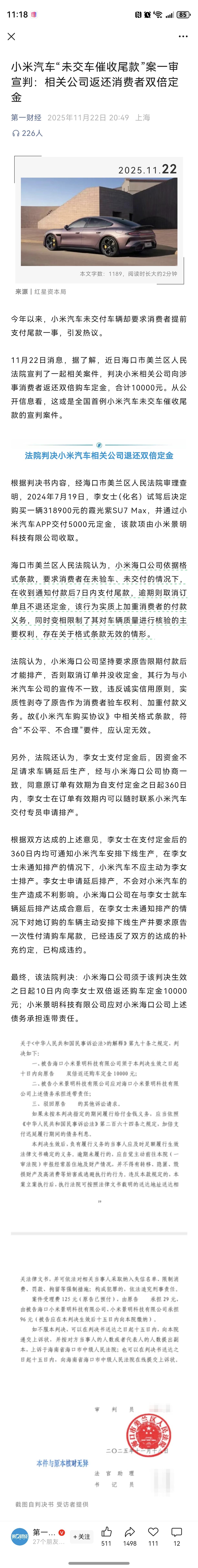 小米汽车“未交车催收尾款”案一审宣判:相关公司返还消费者双倍定金! 这是最近的