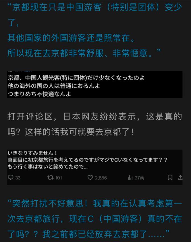 日本人这几天特别高兴,他们发现日本各大热门景点人少了七成,日本人说,中国人这些天不来日本,日本一下子变得舒服了! 近日日本社交平台上一条帖子火了,发帖人晒出京都一辆空无一人的电车照片,配文说现在京都只是中国游客尤其是团体游客少了,其他国家游客没少,去那里玩特别舒服惬意。 这条内容的阅读量很快冲到了1289万次,评论区里挤满了参与讨论的日本网友。 不少人在评论区里追问发帖人,确认中国游客是不是真的少了,有人说自己之前因为人太多,早就放弃去京都旅行的想法了,现在要是真的人少,打算马上安排行程。 发帖人回复说,外国游客确实还在,只是中国游客按他的感受来看,大概少了七成。 这个发帖人不是第一次提中国游客减少的事,之前几天就发过好几条相关内容。 他说从上周开始,京都市里的人流就明显少了些,还提到之前那些大声喧哗、举止粗鲁的中国游客不见了,正好赶上红叶观赏期,现在去玩特别合适。 他甚至说,那些中国人开的、专门做中国人生意的民宿、出租车公司、和服租赁店还有土特产店,已经有不少接连倒闭,觉得这可能会让京都的房地产市场有新变化。 他还举例说,平安神宫西边有家叫“十二十二”的商业设施,本来是做中国团体游客生意的,现在完全没有顾客。 不光京都,东京也有日本人有类似感受。 有人说早上去浅草寺,以前常见的中国游客几乎看不到了,寺庙里安静了不少,之前有人在手水舍刷牙、乱取水的情况也没再出现,终于能好好感受浅草寺的氛围了。 还有人说这周在银座、涩谷这些繁华地段转了转,也明显觉得人少了。 这些言论下面,有网友顺势聊起了下一个可能被吐槽“没礼貌”的国家,有人猜是韩国或俄罗斯,还有人提到越南,说那边的人不光没礼貌,甚至像犯罪组织。 不过也有不同声音,有网友算了笔账,说中国游客要是真的不来,日本观光业可能要损失2兆2000亿日元。 但这个说法很快被反驳,反驳的人说不能只算损失,中国游客少了也有好处,那些被中国团体游客吓跑的其他国家游客,可能会愿意来日本了,日本人自己也敢去热门景点了。 还有些网友的想法更极端,说就算旅游的中国人少了,在日本定居的中国人还不少,希望能加强对这些人的管理。 普通民众聊得热闹,日本旅游业的商家却笑不出来。 这场游客减少的影响,已经实实在在落到了他们头上,而且从北海道到中部地区,再到京都这样的旅游城市,几乎全面波及。 北海道札幌市马上要举办冬季传统活动“慕尼黑圣诞市场”,去年这个活动吸引了169万人,是当地冬天旅游的重头戏。 可就在旺季要开始的时候,多家酒店接到了中国游客的取消订单,札幌中央区的“SAPPORO STREAM HOTEL”已经收到了超过50个近期入住的确定订单取消通知。 酒店负责人说,他们家七成客人是外国人,其中中国游客占比很高,再这样下去,只能赶紧调整策略,多开发本地客源。 札幌二条市场以前冬天全是来吃海鲜、买特产的中国游客,现在记者去采访,几乎看不到中国游客的身影。 小樽市一家纪念品商店老板更直接,说中国游客是店里的主要客源,要是冬天他们不来,整个商业区都得受重创。 中部地区的情况也没好到哪里去。 三重县松阪市有家酒店,今年四月才开始重点接待中国团体游客,11月20号之后,接连收到取消通知,加起来超过一百名团客。 酒店负责人说,最火的时候一个月能接待三千名中国游客,现在十二月的团体订单几乎全没了,根本不敢想接下来的收入。 爱知县常滑市因为有机场,很多酒店都靠中国旅行团撑着,短短几天内,有些酒店就收到了两千多人的取消订单,而且基本都是旅行社的团体单。 就连之前被网友说“舒服”的京都,酒店和民宿也没能幸免,不少订单被取消,有些民宿的预约取消率已经到了一半。