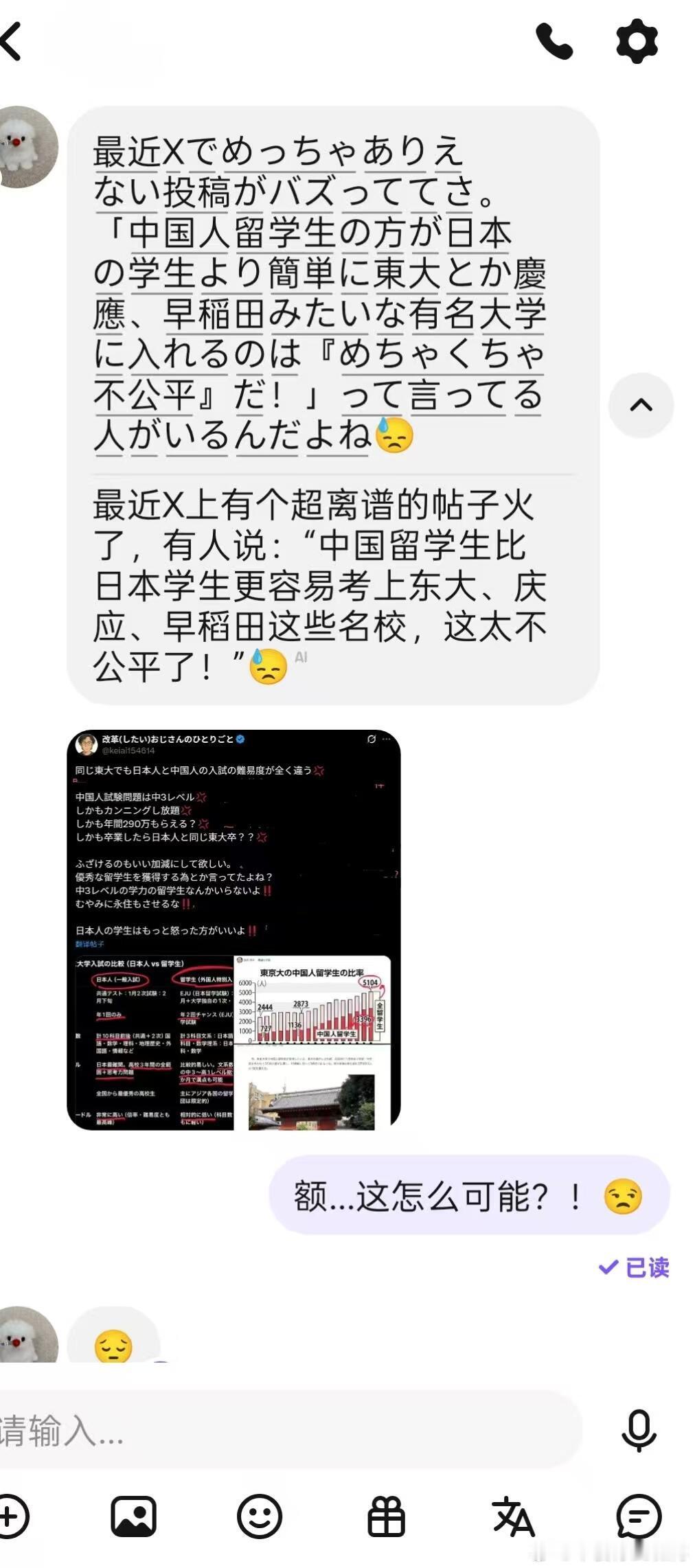 日网说中国留学生只有初三水平还进东大?!离大谱!日网居然说中国留学生靠 “初三水平考试” 进东大??😅HelloTalk的日本朋友说,日区X上的热帖说有人觉得中国留学生入学考试太简单觉得非常不公平...但朋友说日本高中生高三才开始准备考学,补习班都报得晚,论应试能力真可能比不过中国学生!!🫠他曾接触过中国的考卷的难度....如果大家做一样的试卷,咱就说日本人可能根本考不上东大了哈哈哈😂(恕我直言要是一起考共通test,三年后东大就没有日本人了)咱中国教育难度全世界都公认的,怎么可能初中水平出去留学…