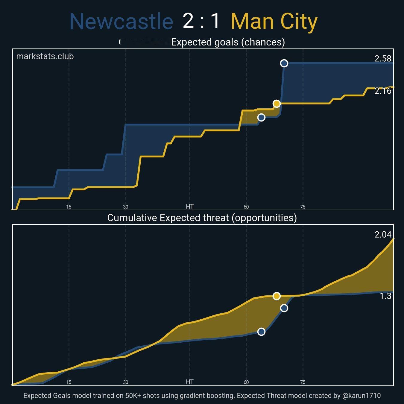 Liverpool 0 : 3 N. Forest▪ xG: 1.26 - 1.12▪ xThreat: 2.38 - 0.81▪ Possession: 73.6% - 26.4%▪ Field Tilt: 80.3% - 19.7%▪ Def Action Height: 54.4 - 31.5▪ Penbox shots: 14 - 9▪ Deep Entries: 21 - 7▪ Buildup completion: 90.3% - 70.0%▪ PPDA: 5.0 - 19.2▪ High turnovers: 4 - 5Newcastle 2 : 1 Man City▪ xG: 2.58 - 2.16▪ xThreat: 1.3 - 2.04▪ Possession: 32.3% - 67.7%▪ Field Tilt: 25.2% - 74.8%▪ Def Action Height: 49.5 - 47.2▪ Penbox shots: 7 - 14▪ Deep Entries: 9 - 23▪ Buildup completion: 76.5% - 90.3%▪ PPDA: 11.2 - 7.4▪ High turnovers: 1 - 2在很多基本的技术面上碾压对手,但就是赢不了,甚至被打爆怎么对付善于控球组织进攻和有“技术优越感”的球队英超是独一份