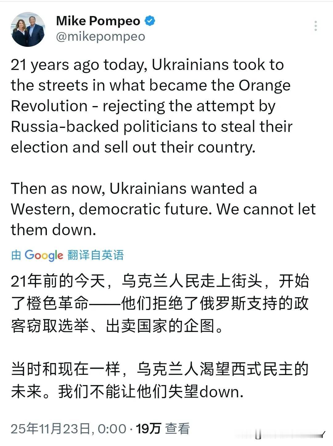 美国前国务卿蓬佩奥11月23日发文:“21年前的今天,乌克兰人民走上街头,开始了橙色革命。 他们拒绝了大毛支持的政客窃取选举、出卖国家的企图。当时和现在一样,乌克兰人渴望西式民主的未来。我们不能让他们失望。” 美国前国务卿蓬佩奥这话听着是给乌克兰站台,可细品品,满肚子都是对特朗普那28条计划的不忿,只是敢怒不敢言罢了。 特朗普的行事风格向来独来独往,政策主张常常和蓬佩奥这类政客的“老套路”拧着来。蓬佩奥心里怕是早把特朗普骂了千百遍,可嘴上半句不敢多说。谁让特朗普是老板?下属再有意见,也得憋着。 就说那28点新计划,特朗普逼着乌克兰最晚本月27日就得接。这计划明摆着是美国把乌克兰给“卖了”,蓬佩奥能看不出来?只是位卑言轻,只能借着纪念橙色革命说几句漂亮话,发泄发泄心里的憋屈。 橙色革命那会儿,美国可是卯着劲支持乌克兰街头运动,把“西式民主”吹得天花乱坠,说要帮乌克兰摆脱大毛影响。如今呢?特朗普的计划一抛,之前的承诺全成了泡影。 这前后对比,像打了蓬佩奥这类“传统派”的脸——他们一辈子信奉的地缘政治套路,在特朗普这儿说扔就扔。蓬佩奥心里能平衡吗?肯定不能。 他这类政客,一辈子琢磨的就是怎么拉拢盟友、遏制对手,把民主人权挂在嘴边当工具。可特朗普不管这套,只算利益账,觉得乌克兰是包袱,想快点甩掉。这等于否定了蓬佩奥们一辈子的政治信仰,换谁都得窝火。 可窝火归窝火,他敢明着反对吗?不敢。特朗普在共和党里的根基深,蓬佩奥还想在政坛混,就得夹着尾巴。只能借着纪念橙色革命,暗戳戳地表达不满——你看,21年前我们支持乌克兰追求民主,现在怎么能撒手不管? 只是这话骗得了别人,骗不了自己。特朗普的28条计划,说白了就是让乌克兰割地、裁军,认下打输的事实。美国之前喊的“支持乌克兰到底”,成了笑话。蓬佩奥再怎么喊“不能让他们失望”,也挡不住美国要“出卖”乌克兰的事实。 这事儿透着股荒诞。美国的对外政策,一会儿喊着理想主义,一会儿又玩起现实主义,全看当家人的脾气。蓬佩奥们就像戏台子上的配角,老板换了剧本,他们再不适应也得硬着头皮演。 乌克兰人看了蓬佩奥的话,怕是只能苦笑。21年前的橙色革命,他们以为选对了路,能奔向“西式民主”的好日子。可到头来,美国说变脸就变脸,为了自己的利益,能把他们当筹码抛出去。所谓的“支持”,不过是利益交换的幌子。 蓬佩奥的憋屈,其实是美国政坛老派势力的缩影。他们习惯了按部就班地搞地缘博弈,却被特朗普这类“非主流”打得措手不及。可政治这东西,向来是成王败寇。特朗普能把自己的主张推下去,哪怕再离谱,也说明他摸准了一部分人的脉。 只是苦了乌克兰。成了美国两派政客角力的牺牲品,一会儿被捧上天,一会儿被踩在地。蓬佩奥的几句漂亮话,改变不了特朗普要逼他们签协议的事实。所谓的“西式民主未来”,在现实利益面前,脆弱得像张纸。 说到底,蓬佩奥的发文,不过是给自己找个台阶下。既表达了对特朗普政策的不满,又没明着撕破脸,还能在国际上维持“支持民主”的形象。可这戏演得再真,也掩不住美国对外政策的自私和短视。 乌克兰人该明白,把希望寄托在别人的“支持”上,本身就是场赌博。美国的政客们,嘴里喊着理想,心里算着利益,什么时候真把乌克兰的死活放在心上?橙色革命过去21年,乌克兰非但没过上好日子,反倒陷入战火,这还不够说明问题吗? 蓬佩奥的憋屈,终究是美国内政的事。乌克兰的命运,却被这场内斗裹挟着走向未知。等到11月27日,不管乌克兰愿不愿意,特朗普的计划怕是都要压下来。到那时,蓬佩奥的“不能让他们失望”,只会成了又一个国际笑话。