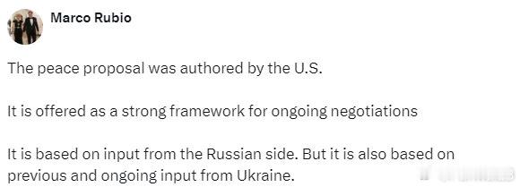 美媒,一份据称由美俄两国高级官员共同起草的乌克兰28点和平协议引发了国会民主党和共和党议员数日的强烈抗议。今晚,共和党参议员迈克·朗兹在与国务卿马可·卢比奥通话后宣布,流传的这份提案实际上是俄而非美国撰写的文件。参议员安格斯·金表示,这份据称由自称代表俄的官员提供给白宫特使史蒂夫·威特科夫的泄露计划,本质上是俄提出的一系列要求,并非特朗普政府的立场。无论是朗兹、金,还是其他任何参议员,似乎都不明白为什么政府花了三天多的时间才澄清,这份包含28项内容的计划并非美国国务院正在推行的政策。赴哈利法克斯代表团的共和党参议员表示,他们还从鲁比奥国务卿那里得知,他并不知晓向乌克兰发出的任何“最后通牒”,要求乌克兰在感恩节前同意停火计划,并威胁要撤回对基辅的物资和情报支持。现在卢比奥已经再次发小论文,再次改口说,投降计划就美国特朗普总统搞的,虽然是依据大递的精神。