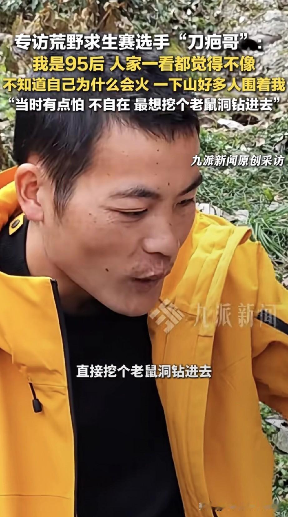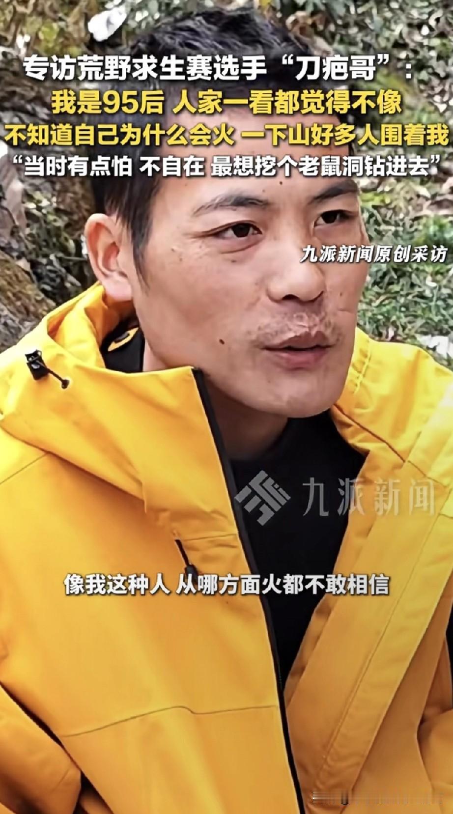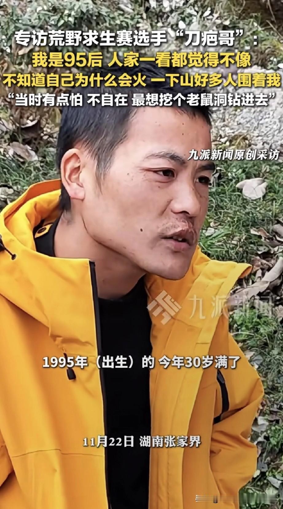刀疤哥95后糙汉脸火成顶流,下山被围到想钻老鼠洞 湖南张家界,当我对着眼前这张“饱经风霜”的脸说出“您看着真不像95后”时,刀疤哥挠挠头笑了:“1995年的,今年刚满30,人家见我都以为奔五了。” 这个荒野求生赛里徒手造庇护所的狠人,下山时直接懵了——乌泱泱的人群举着手机围上来,他攥着衣角:“当时腿都软了,真怕,想找个老鼠洞钻进去。” 谁能想到,这个话少、脸“糙”的汉子,成了全网追着要“学生存”的顶流?他搓着手说“我这种人咋会火”时,身后的粉丝还在举着花喊“刀疤哥好帅”。 你说,是他的“反差脸”戳中了大家,还是现在的网友就爱这种“野生真实感”?