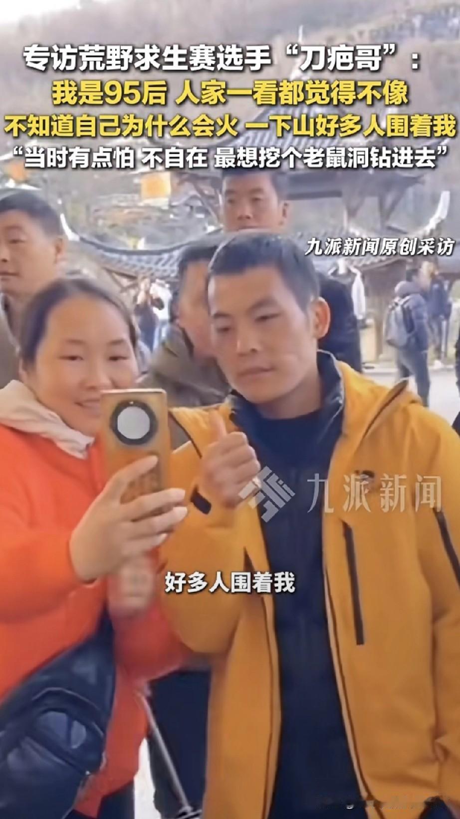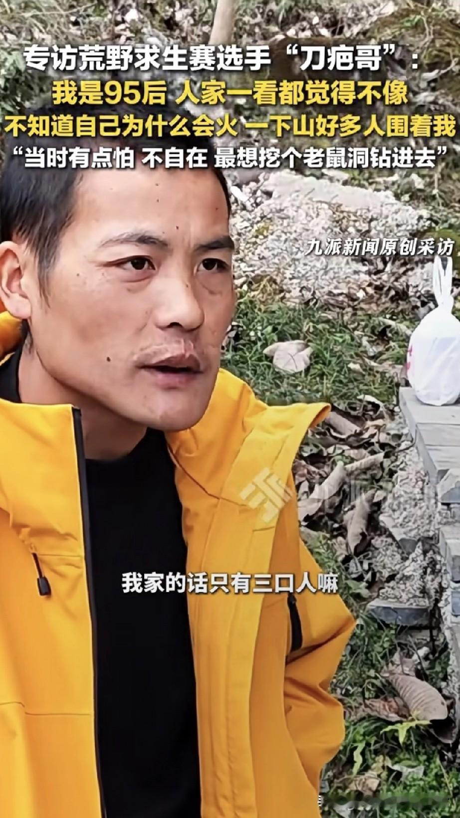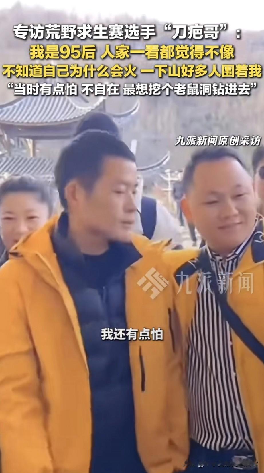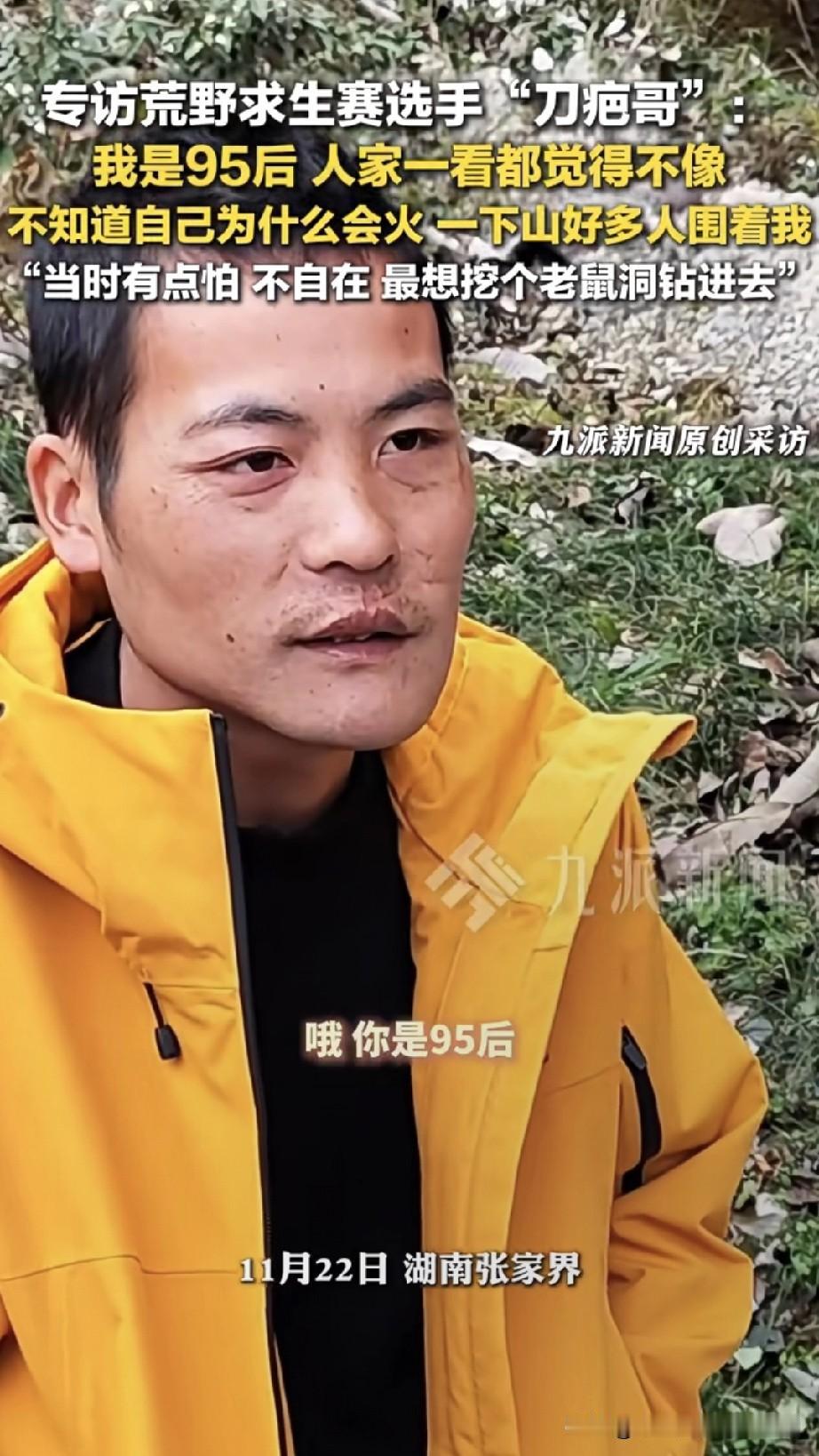 刀疤哥95后糙汉脸火成顶流,下山被围到想钻老鼠洞 湖南张家界,当我对着眼前这张“饱经风霜”的脸说出“您看着真不像95后”时,刀疤哥挠挠头笑了:“1995年的,今年刚满30,人家见我都以为奔五了。” 这个荒野求生赛里徒手造庇护所的狠人,下山时直接懵了——乌泱泱的人群举着手机围上来,他攥着衣角:“当时腿都软了,真怕,想找个老鼠洞钻进去。” 谁能想到,这个话少、脸“糙”的汉子,成了全网追着要“学生存”的顶流?他搓着手说“我这种人咋会火”时,身后的粉丝还在举着花喊“刀疤哥好帅”。 你说,是他的“反差脸”戳中了大家,还是现在的网友就爱这种“野生真实感”?