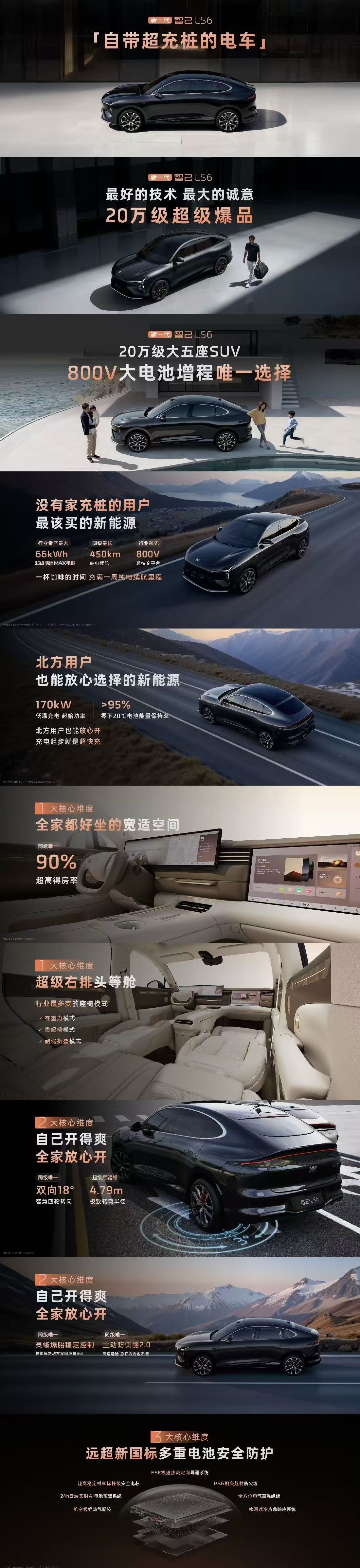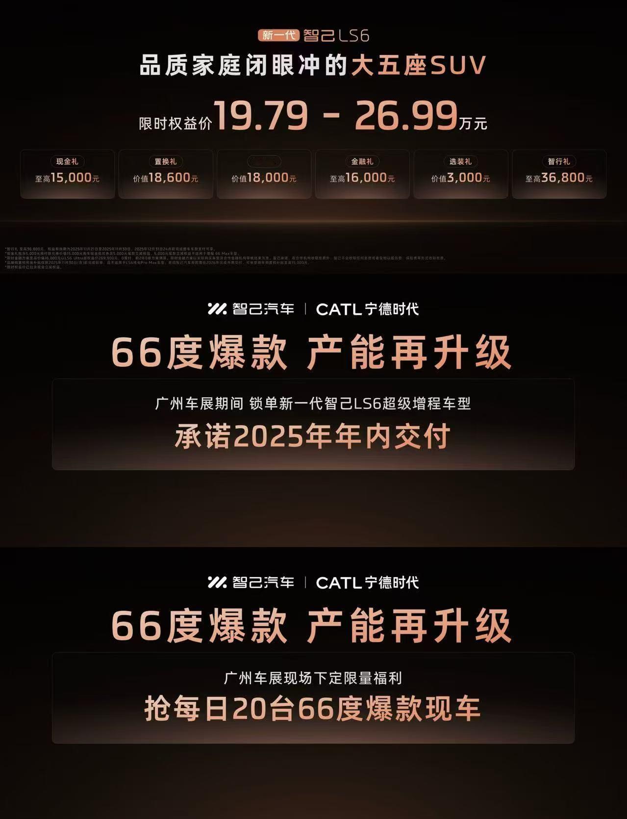 广州车展现场也看到了智己LS9,外观很豪华,配置更豪华,灵蜥底盘3.0+双向24度四轮转向,4.95m转弯半径比小车还灵活,1500+km续航+4秒级加速,B&O音响+4D按摩座椅,以及IM AD Max辅助驾驶系统,操控、续航、座舱舒适和辅助驾驶能力,实力在线。上市25分钟,大定突破5000台,入门即顶配,全系皆Ultra的吸引力还是很强的。这次广州车展重磅加码,限时锁单兜底购置税,至高15000元,而且正式开启全国交付。智己另一个看点是20万级爆款新一代LS6,66度大电池纯电450km,800V超充15分钟补能310km,增程一体式热管理架构,北方冬季续航不打折。双向18度智慧四轮转向,配备灵蜥爆胎稳定控制和主动防侧翻功能,灵活好开,也保障驾控安全。同样的广州车展福利加码,车展期间下定并锁单可在年内提车,广州车展现场福利,每天20台超级增程66度现车,现场下订,现车立提。喜欢豪华体验的可以冲智己LS9,在意实用和续航的可以多看看LS6,都是高颜值精品。