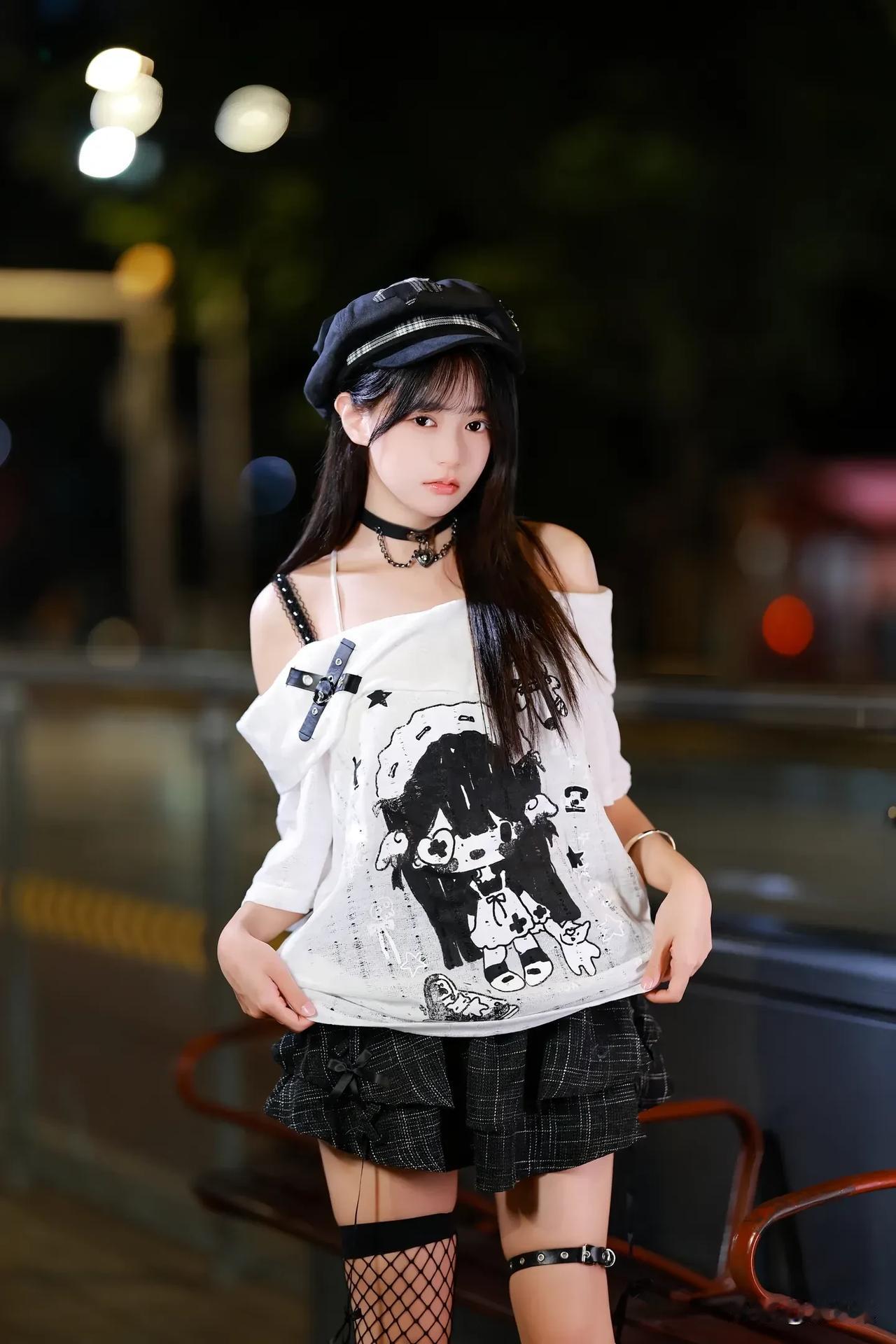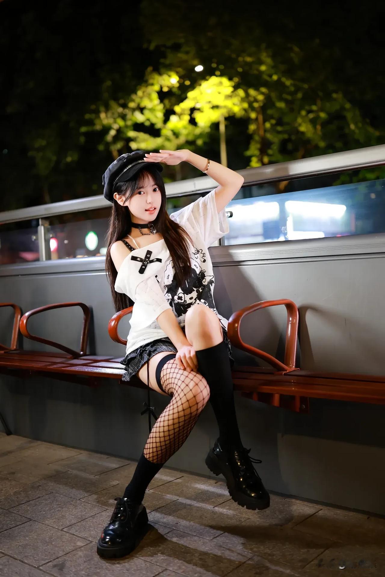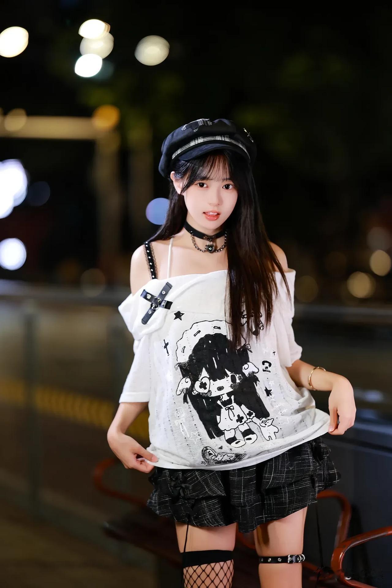 夜色中的酷炫少女,黑帽与白T的完美搭配,时尚感爆棚!🌙✨