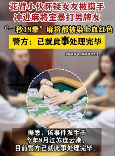 江苏一小伙怀疑女友被男牌友摸手,冲进麻将室暴打男牌友,女友一个劲解释:他没有摸我,一直在打牌!旁边人也帮忙作证,可小伙根本不听,还多次用麻将砸向对方,“一秒18拳”麻将都被染上血红色,网友:冲动是魔鬼! 当天,小伙的女友正和几位朋友在麻将室打牌娱乐。小伙突然到访,远远看到女友与邻座男牌友手部有短暂接触,便认定对方故意摸女友的手,瞬间怒火中烧,径直冲到男牌友面前,一把将其从座位上拽起,挥拳便打。 “他没有摸我!我们一直在打牌,只是出牌时不小心碰到了!”女友见状急得直跺脚,一边拉拽小伙,一边反复解释。旁边的牌友和老板也纷纷上前作证,称全程未看到男牌友有不当举动,只是正常牌桌互动。但此时的小伙已被愤怒冲昏头脑,完全听不进任何辩解。 他挣脱众人阻拦,对着男牌友拳打脚踢,监控画面显示,小伙出手又快又狠,现场一片混乱。冲突结束后,被打男牌友头部、面部多处受伤,鲜血直流,散落的麻将牌上也沾满了血迹,触目惊心。 牌友随后报了警,目前,警方已就此事处理完毕。网友“冲动是魔鬼,一点小事就下这么重的手,太不值了”“情侣间缺乏信任,遇事不冷静,最终害人害己”。
