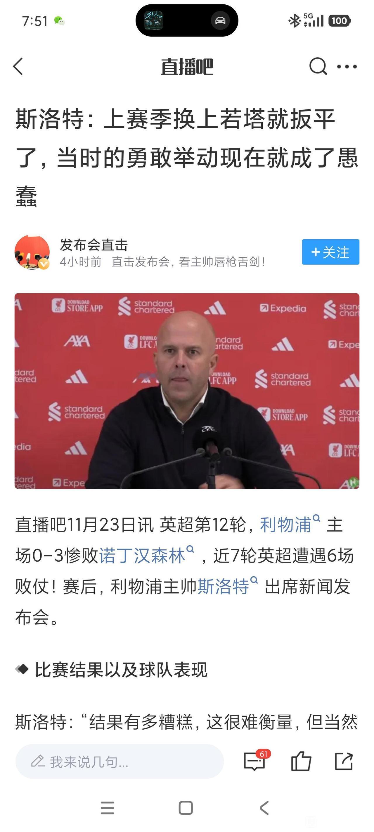 斯洛特不行呀,他说上赛季换上若塔就扳平,本赛季换人反而愚蠢.... 他不知道若塔不在了吗! 而且利物浦其他跟上赛季不一样,其他英超球队也研究过利物浦了,还在不变动。 瓜迪奥拉打法老套,用了十年。 斯洛特去年东西,今年还用,真快降级了。[皱眉]