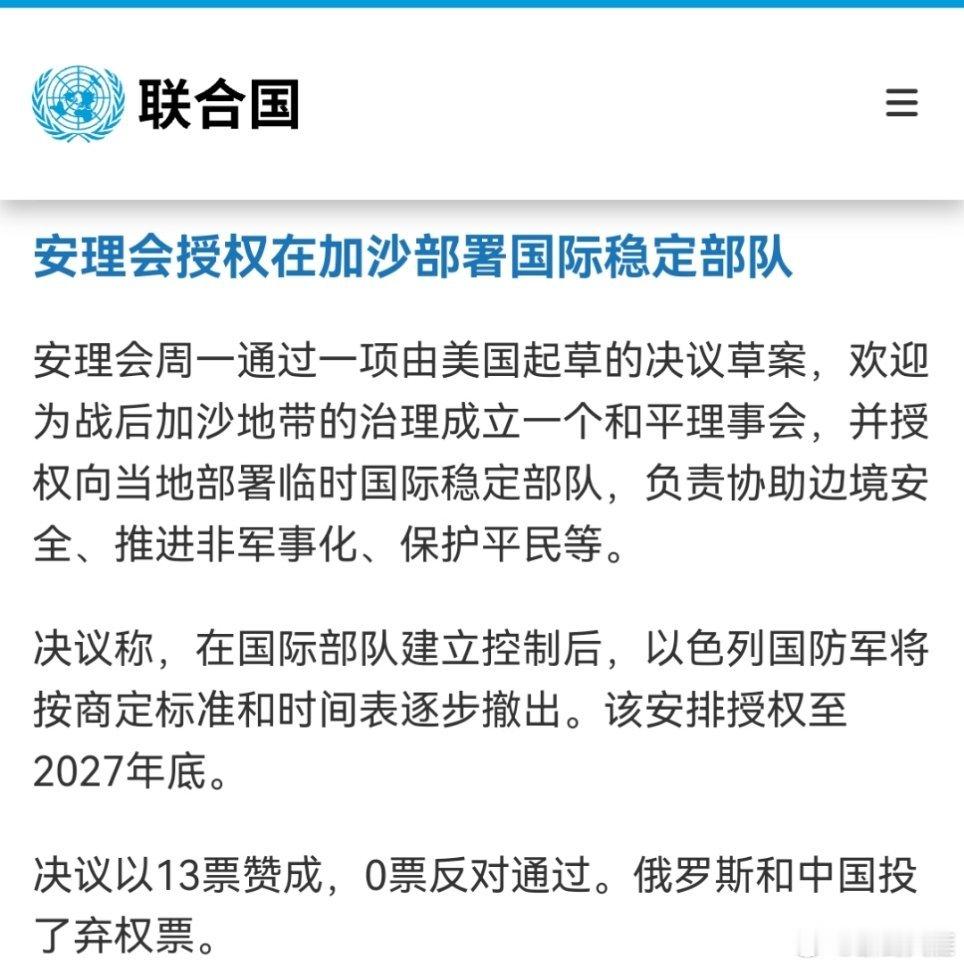 安理会授权在加沙部署国际稳定部队安理会周一通过一项由美国起草的决议草案,欢迎为战后加沙地带的治理成立一个和平理事会,并授权向当地部署临时国际稳定部队,负责协助边境安全、推进非军事化、保护平民等。 决议称,在国际部队建立控制后,以色列国防军将按商定标准和时间表逐步撤出。该安排授权至2027年底。决议以13票赞成,0票反对通过。俄罗斯和中国投了弃权票。(联合国)