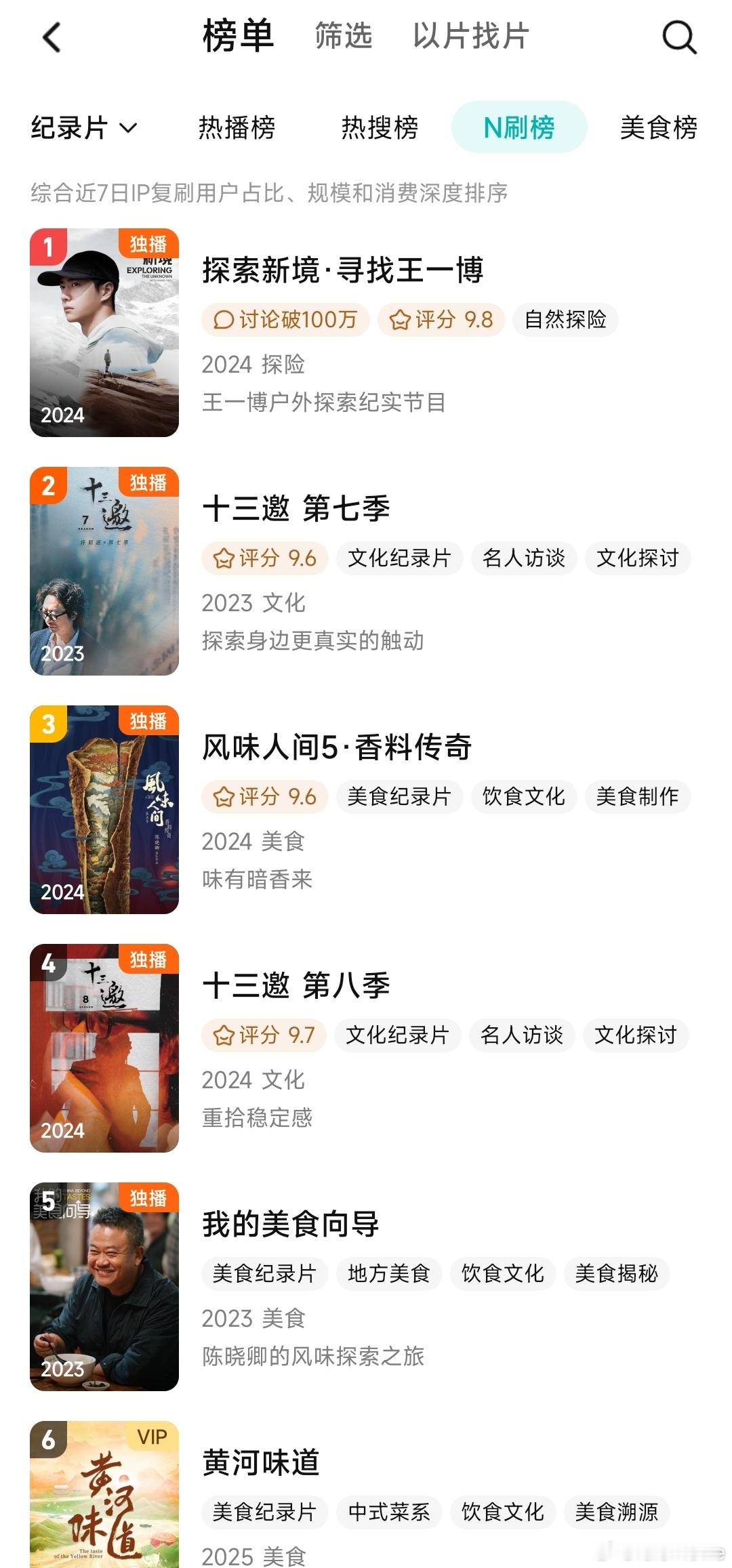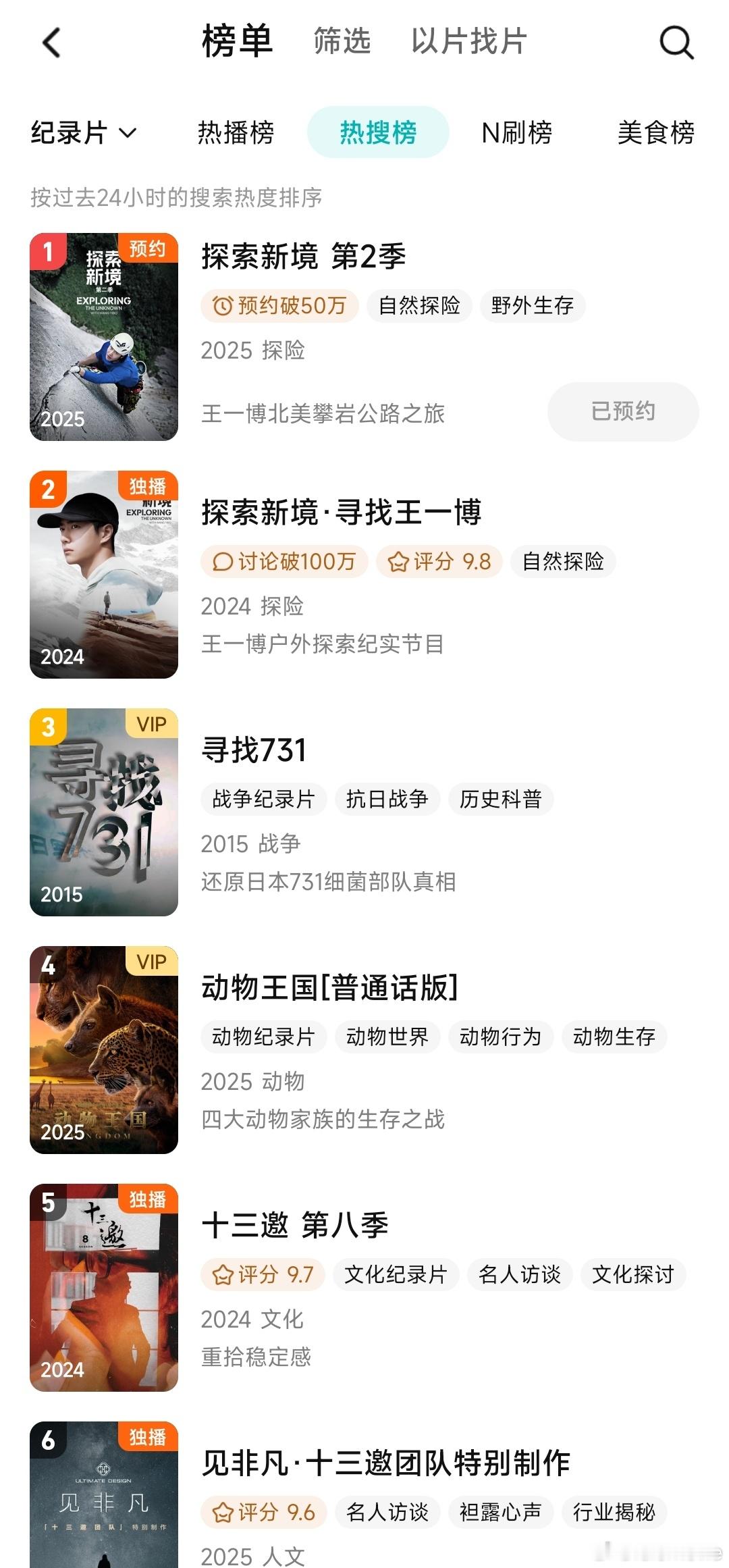 《探索新境2》预约破62万,第一二季包揽热搜榜前两位,许多人已经开始重刷第一季了,也助其登顶N刷榜第一。好作品就是这样,经得起时间的沉淀,也能吸引大批路人,再加王一博向上的生命力,强大的精神内核,永远的正能量,实至名归的了不起的中国青年,国家和国民都喜欢。探新境,索心境,每一步都算数。