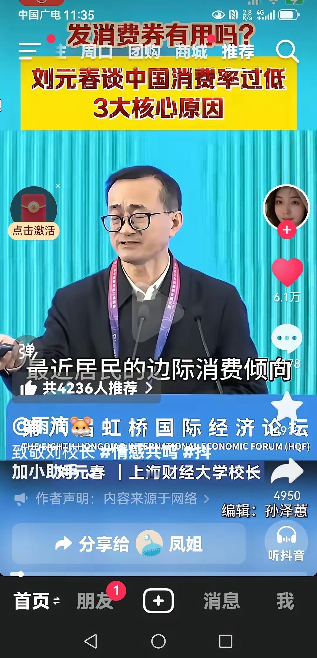 上海传媒大学校长刘元春在虹桥国际论坛上说:我们消费过低,就是分配问题,是老百姓收入太低了。 有专家持不同意见:给老百姓钱再多,他都存银行了不消费。 但是刘校长不这么认为,中国居民消费过低就是收入问题分配问题。钱太少了,老百姓根本就不敢花,他们只有把钱存起来抵抗不确定风险。 有网友说:主要是社会保障问题,不是纯粹的收入问题。西欧,比如德国、法国、英国,他们的收入普遍并不高,两三千欧元的很普遍,但是这些国家社会保障公民福利很到位,所以老百姓并不存钱。 国际上做法是给高收入者增加税收,补贴低收入群体。---中国恰恰相反,高收入者的税收不起来,像京东刘强东,明面工资1块钱! 刘教授一语中的!道出了中国的问题所在!也是中国强国之路上的最大拦路虎! 刘老师说的对,激活国内市场,必须提高大众消费能力,提高大众消费能力,首先提高百姓收入。目前最首要的问题,是解决分配问题。贫富悬殊增大,增多,广泛的中低阶层收入疲软,收入下滑,因而忧虑住房,医疗,教育,对未来没有确定性,因而就考虑存储,捂紧钱袋子是首要选择。 大家怎么看呢?