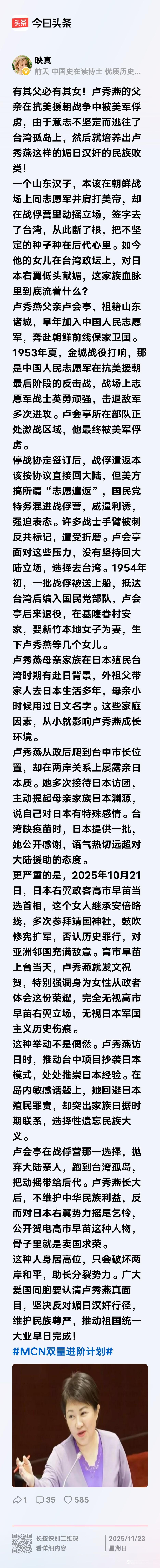 卢秀燕暴露出来的嘴脸,证明了一个道理,有什么样的爹就有什么样的女儿,背叛者的血脉基因当中,流淌着背叛的基因,让人鄙视,令人不齿,在考察一个人的时候,考察一下其祖宗三代,这是非常有必要的,而且也非常容易看清一个人的底细,正可谓,种瓜得瓜,种豆得豆,这一点非常重要!