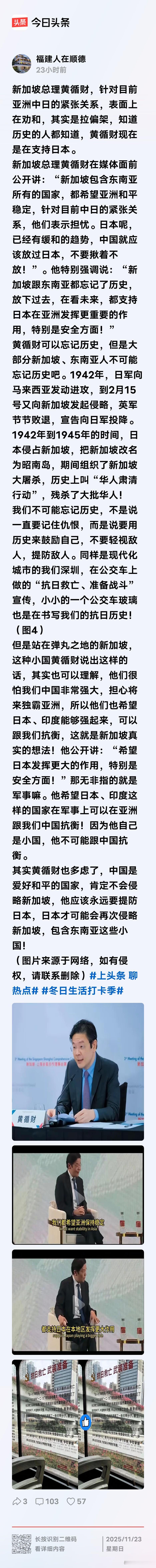 新加坡的黄循财对日本比较暧昧,说出来的话也是站队日本,阴阳我们,实实在在说,这就有点不地道了,这就是罔顾事实的拉偏架,这就是睁着眼睛说瞎话,这就是好了疮疤忘了疼,忘记了自己也曾经有被日本鬼子侵略的历史,说他数典忘祖,一丁点也不过分!