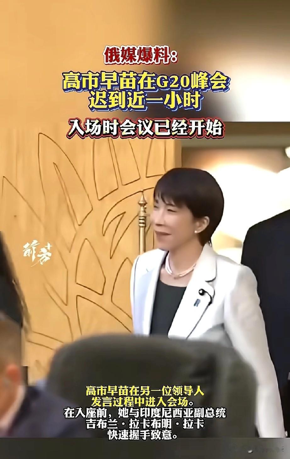 高市早苗耍大牌,在G20峰会上居然迟到一个多小时,这是在所有参会国家中,唯一一个迟到的,据说迟到的原因很有意思,在挑选衣服的过程中耽误了时间,这样一个面目狰狞、丑陋无比的人,还如此注重穿着打扮,真是滑天下之大稽,不管穿上啥衣服,也难以掩饰它丑陋的嘴脸,这下子好了,磕碜丢大了!