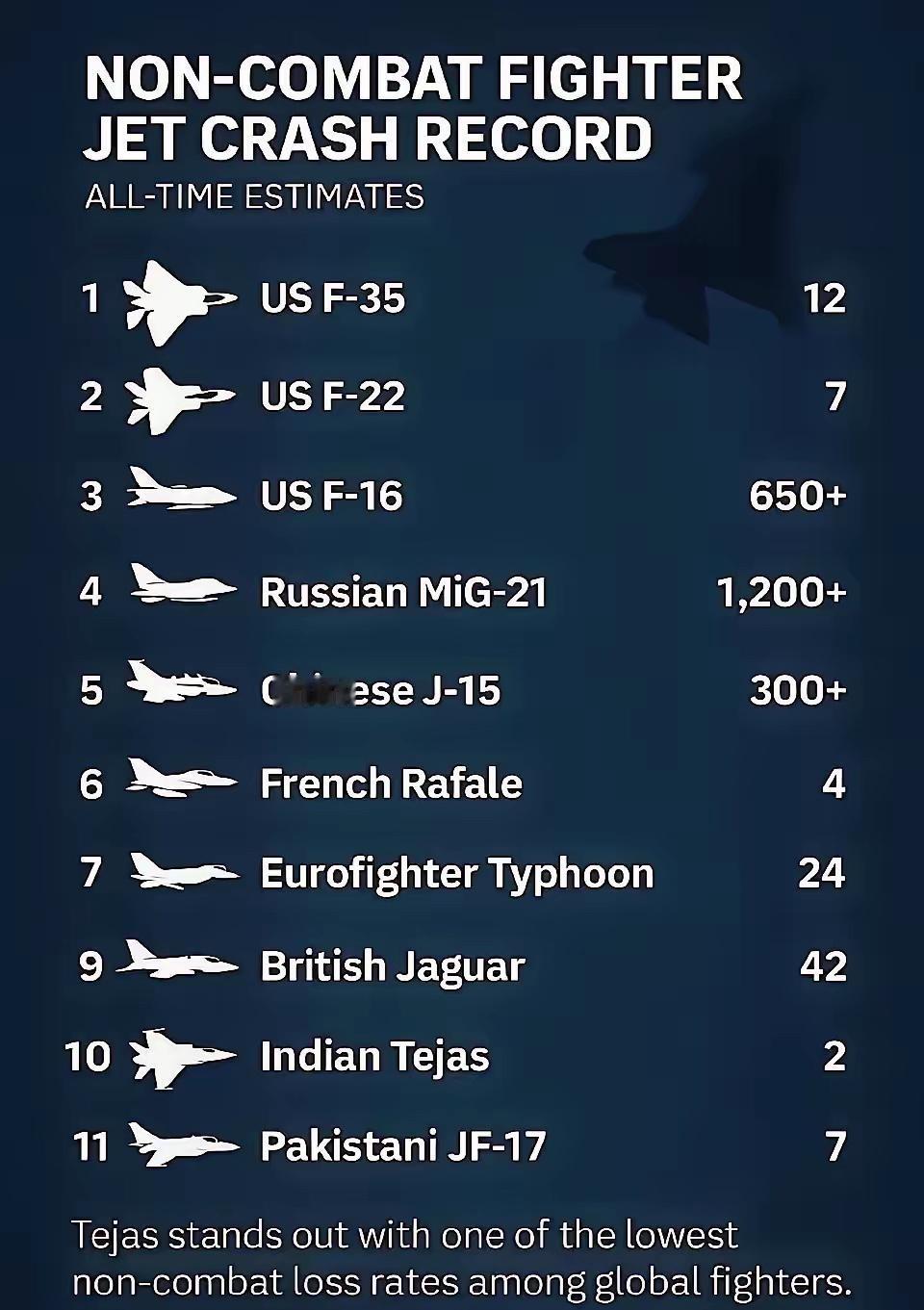 印度人的脑回路很奇特 近日迪拜航展,印度战机坠毁,但三哥向来好面子,在航展丢失的颜面必须找理由挽回。 有好事的印度人把世界各国战机坠毁数量排了一个序,目的就是为了证明印度“光辉”战机是坠毁数量最少的战机! 这张图表显示我国歼15已坠毁300多架,不知道这数据从何而来?我在网上查了一下、截止2025年我国装备歼15系列共100架左右,何来坠毁300架的数据呢? 所以啊,我们不要以正常人的思路去理解三哥的脑回路!