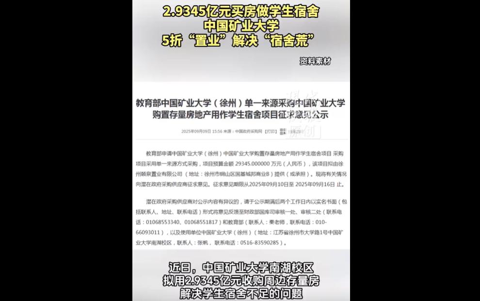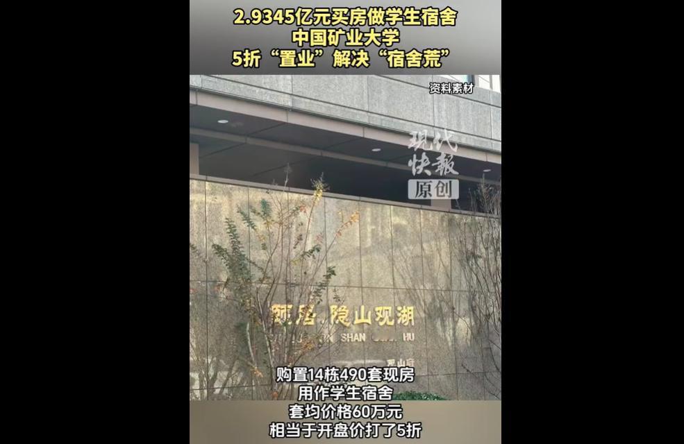 中国矿业大学南湖校区因校内及周边无可用土地自建宿舍,拟斥资 2.9345 亿元收购 490 套现房,套均 60 万元(相当于开盘价 5 折)。 这些房源距校区约 7 公里,户型多样,将用于解决学生宿舍不足问题。 矿大这波操作堪称 “高校宿舍界的神操作”! 没地建宿舍就直接 “团购” 存量房,60 万一套还打 5 折,性价比直接拉满,学生们怕是要从集体宿舍升级到 “学区房” 待遇。 虽说是无奈之下的务实选择,但 7 公里通勤距离得好好规划,希望学校配套通勤班车才贴心。 这种 “以购代建” 的思路既盘活了存量房,又解了宿舍燃眉之急,说不定会成为高校解决住宿难题的新潮流,只能说矿大这波算盘打得太精明!