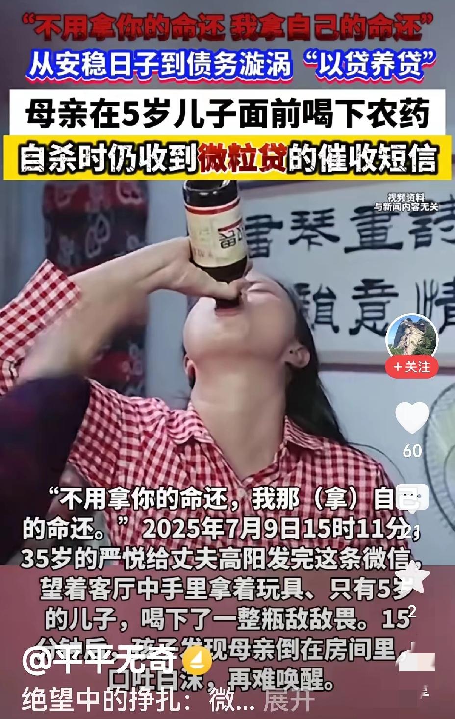 微粒贷催收阴影下:一位母亲的绝望与挣扎 近日,一则“微粒贷催收逼疯母亲”的视频引发热议,播放量超6000次,戳中了无数网友的痛点。视频背后,是普通家庭面对暴力催收的无助困境,更暴露了部分网贷平台催收环节的乱象。 欠债还钱天经地义,但催收绝不能逾越法律红线。那些不分昼夜的电话轰炸、威胁上门的短信,甚至牵连亲友的骚扰,早就违反了监管规定。更讽刺的是,网贷初衷是便民,可暴力催收却把缓解压力的借贷,变成了摧毁家庭的利器。 真正的金融服务该有温度,平台与其花力气搞违规催收,不如给实在困难的借款人协商空间。监管早有明确要求,合规协商、重组分期都是可行路径,何必非要把人逼到绝境? 借贷要量力而行是底线,但被暴力催收时,我们也不该默默忍受。你身边有人遇到过类似情况吗?如果是你,会选择协商还是维权?
