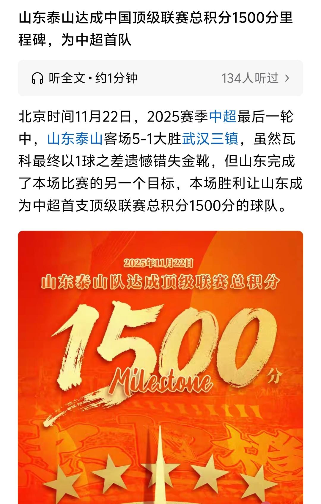 山东泰山成为顶级联赛第一支1500分球队,在中国职业联赛球队中山东泰山或许不是最好的,也不是让广大球迷认可的,但是山东泰山最大的优点就是稳定!