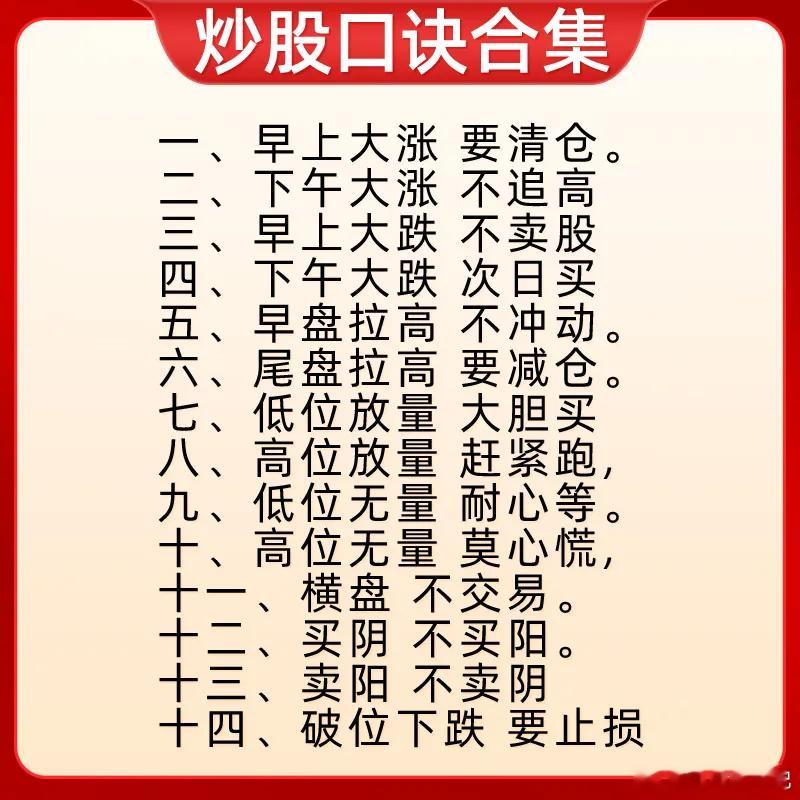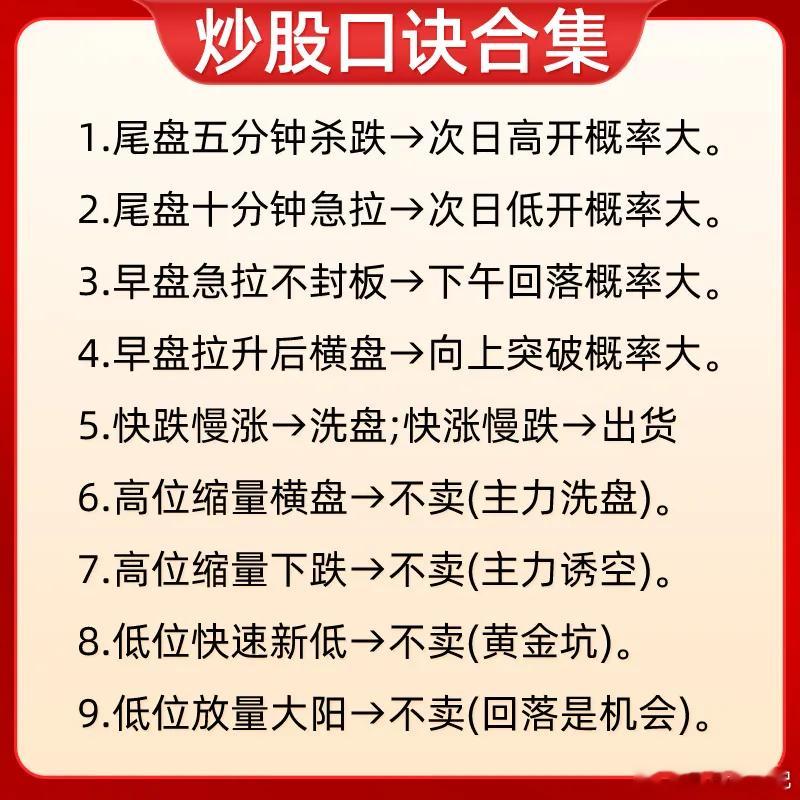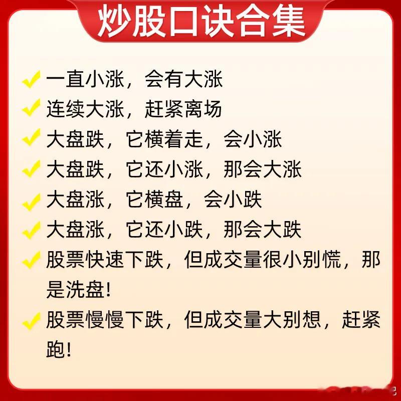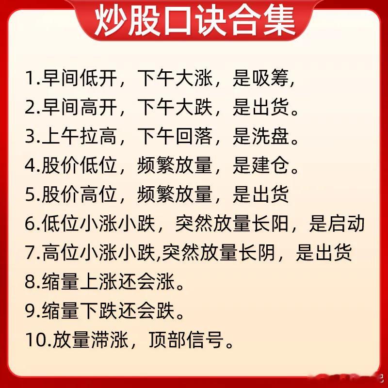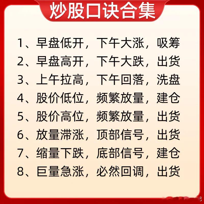 注意了!告诉大家一个快速提高自己盘感能力的方法,那就市场流传很久的一些经典口诀。这些口诀可是说经过千锤百炼,里面包含了量价关系口诀、看盘技巧、均线口诀、还有一些股价的波动,怎么判断是主力在洗盘还在出货,简单一句话,就能理解背后逻辑,像均线口诀中的均线,都是散户常常会用到几条常用均线。可以说是不可多得的口诀合集。可能很多朋友之间也看过一些炒股口诀,我敢说很多人都没真正的去理解,我的建议是,每一句口诀,我们需要结合股价的位置,主力的行为和市场环境来综合的看,客观的去理解,你才能真正领悟每一句话的含义。知其所以然,才知其然。我相信只要牢牢记住这些口诀,消化背后逻辑,对你认知会有不错的提高。下方就是我给大家整理的炒股口诀,希望对大家有启发和帮助,也是最为基础的内容,一定吃透