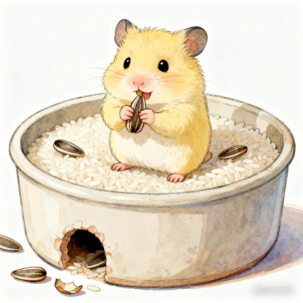 冬日生活打卡季我家仓鼠越狱了,找了半天,发现它在米缸里嗑瓜子——把自己当储粮管理员了。