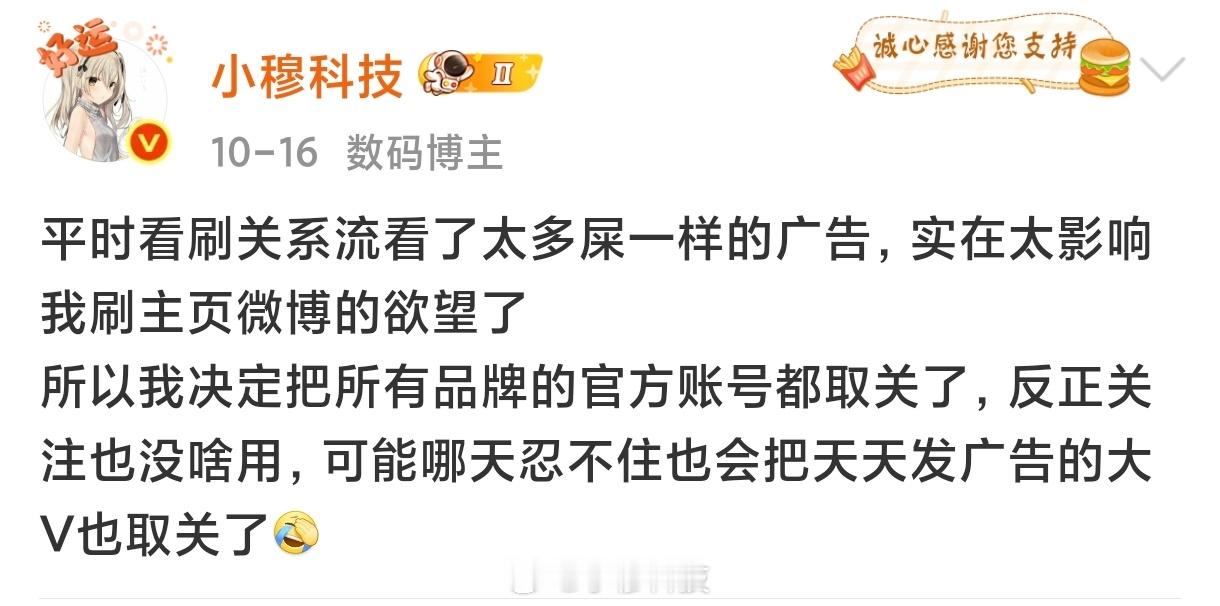 把所有厂商的官方账号都取关后,感觉主页广告少了很多,眼不见心不烦了,推荐有同样烦恼的博主可以尝试尝试