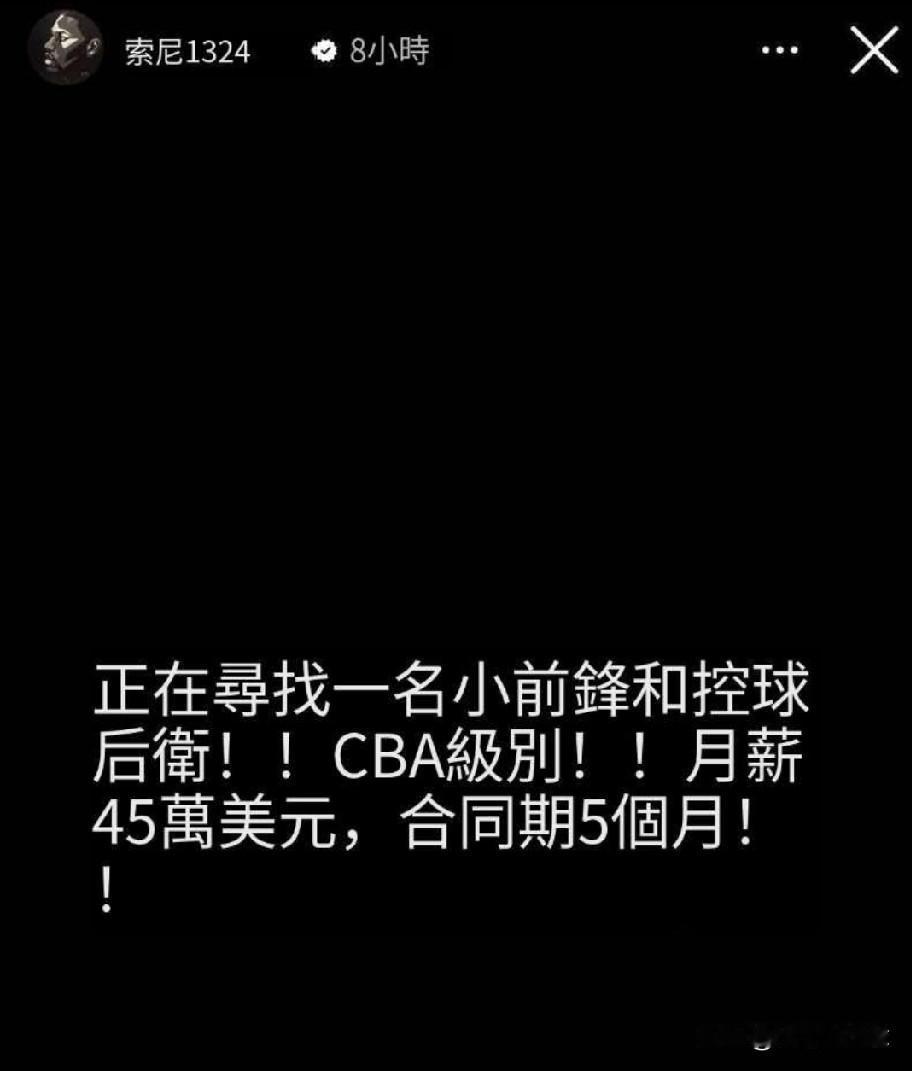 威姆斯为CBA招小前锋和控卫!月薪水45万美元 近日前广东队外援威姆斯在社媒发文,正在寻找一名小前锋和控球后卫,CBA级别,月薪45万美元,合同期五个月,五个月每个月45万美元,加起来就是225万美元,这个价格确实不错,在CBA外援里面也是相当顶级外援的高薪水平了。 可以看出今年CBA开赛太晚,确实影响了很多球队寻找外援,目前还不知道威姆斯是在为哪支球队找外援,威姆斯CBA生涯效力过广东队和山西队,广东队外援基本上确定了,会不会是帮助山西队找外援,毕竟五个月225万一般俱乐部是给不起的,也有人说是北控队,因为北控队的锋线和控卫比较薄弱,而且北控财大气粗,出的起这么高的价格。
