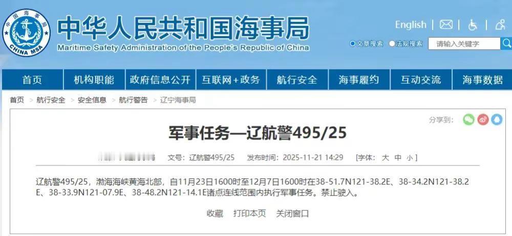 亮剑。据中国海事局网站消息,大连海事局发布航行警告,11月23日16时至12月7日16时,渤海海峡黄海北部部分海域执行军事任务,禁止驶入。看过来