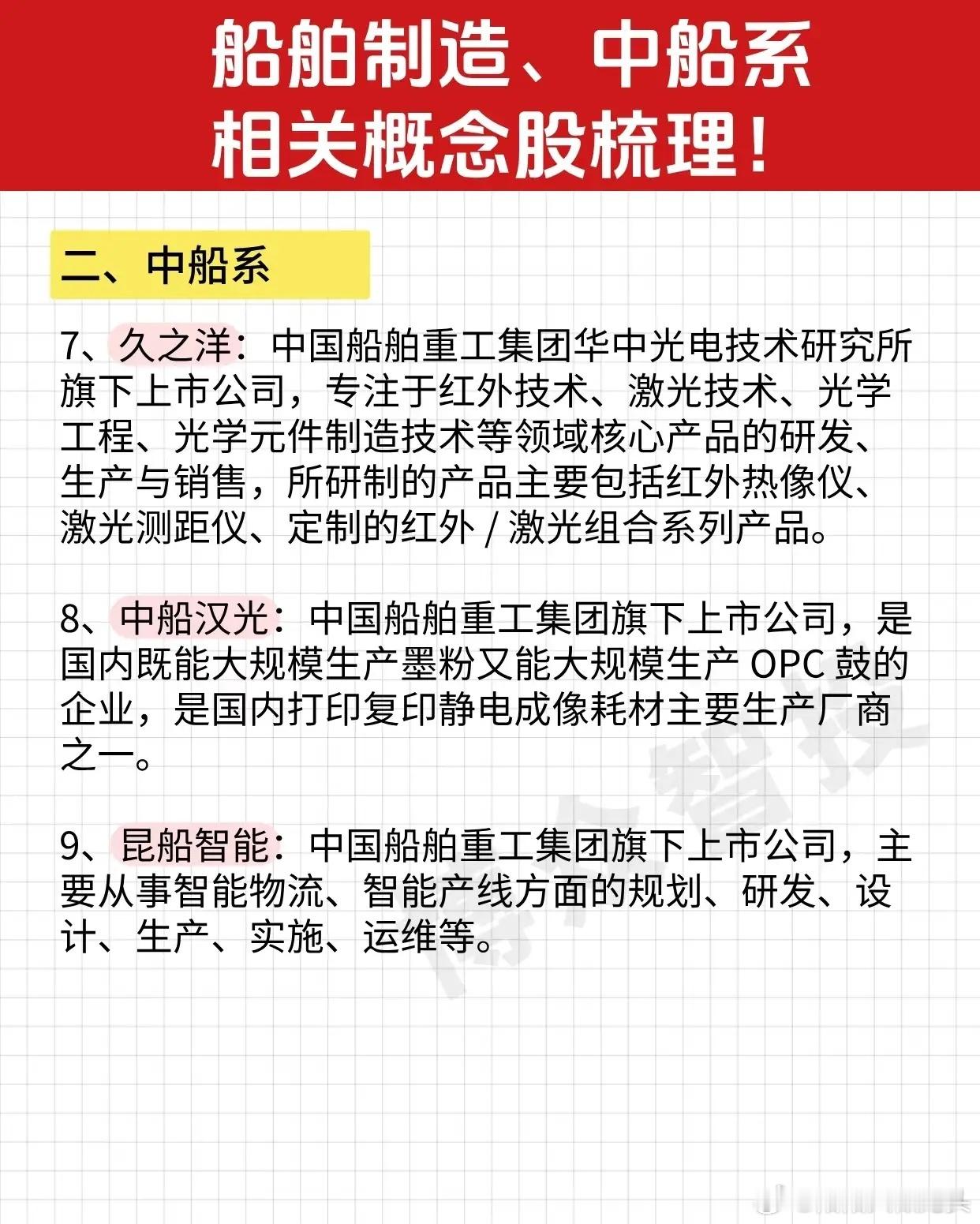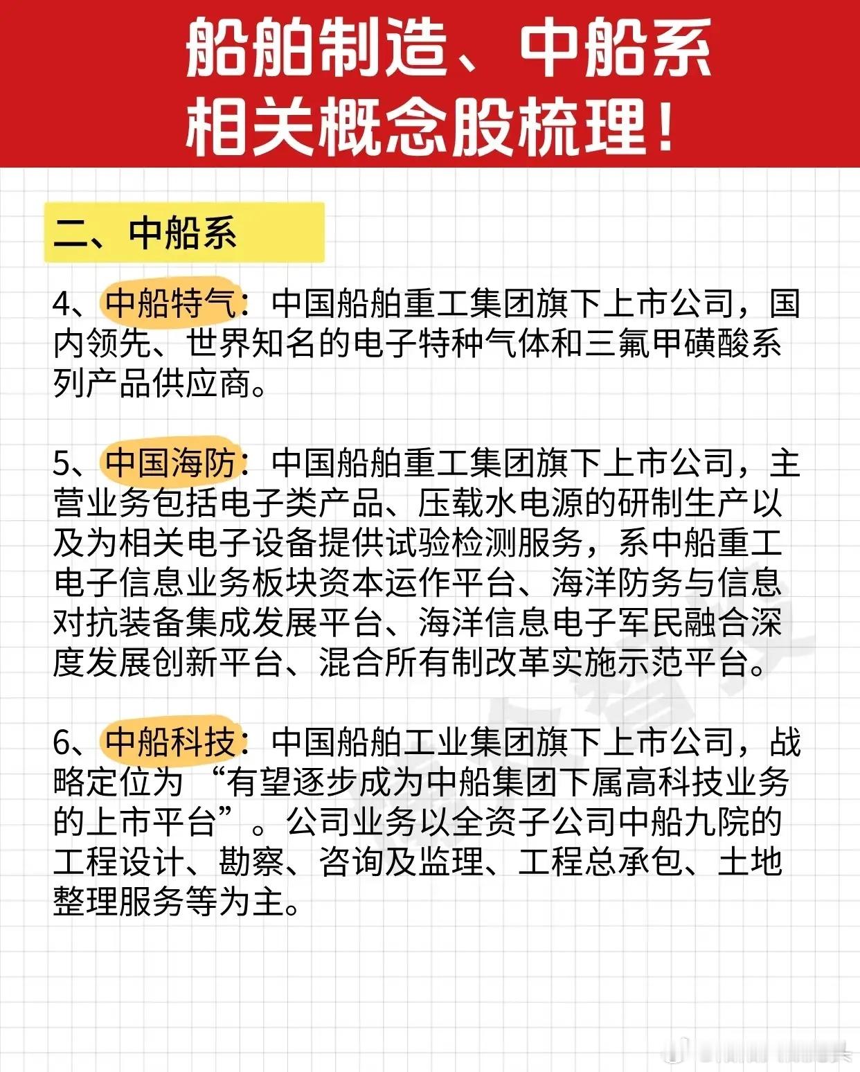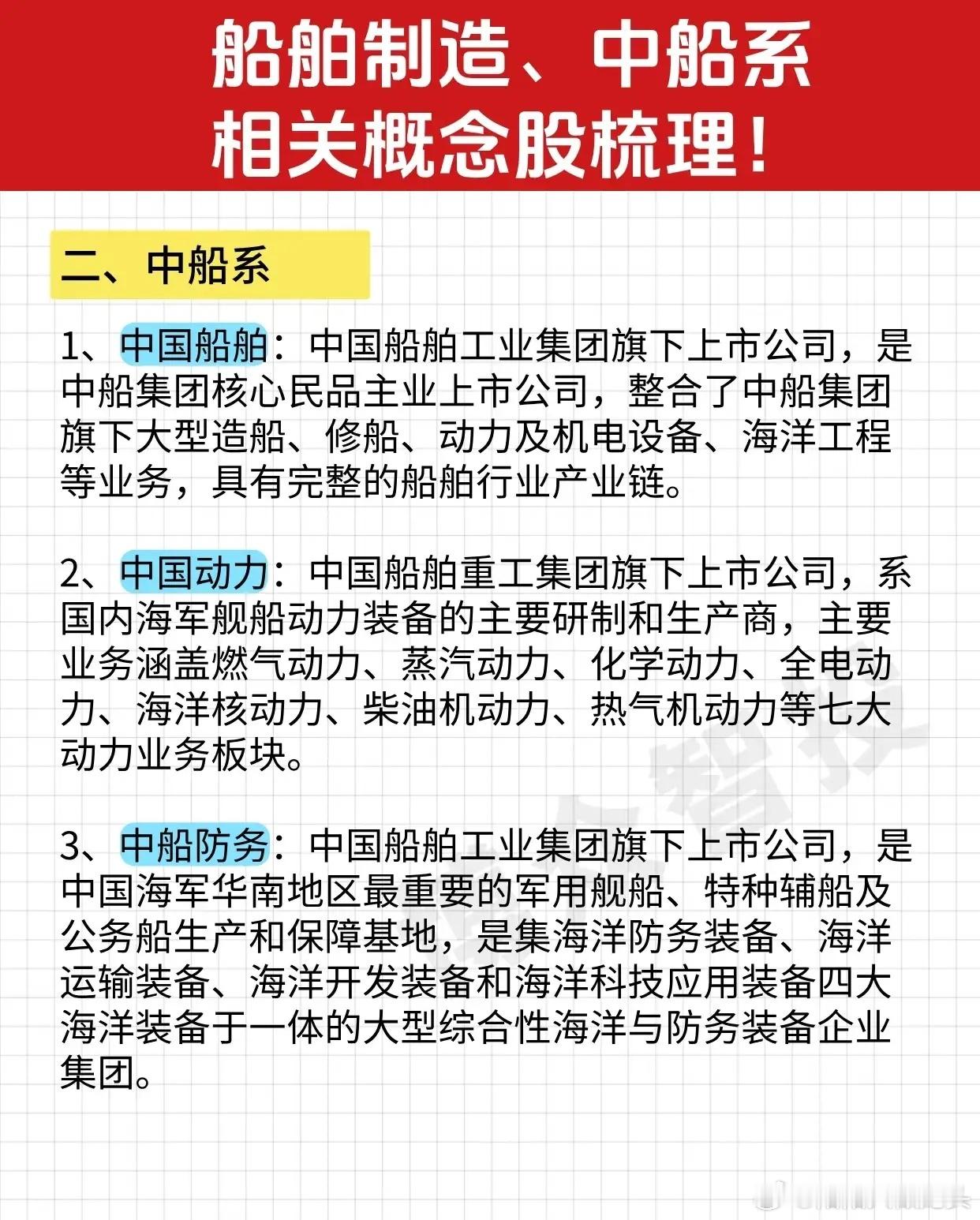 以上内容是对船舶制造及中船系相关概念股的系统梳理,主要介绍了多家在船舶制造及配套领域具有重要地位的上市公司,按业务类别和所属集团进行了分类说明:一、船舶制造相关企业:1. 中国船舶:中国船舶工业集团旗下核心民品上市公司,业务涵盖船舶造修、海洋工程机电设备等,拥有完整的船舶制造产业链。2. 中国动力:中国船舶重工集团旗下公司,是国内海军舰船动力装备的主要研制商,业务包括燃气动力、蒸汽动力、柴油机动力、综合电力、化学动力、热气机动力、核动力(设备)等七大类动力及机电配套。3. 中船防务:同样隶属中国船舶工业集团,是华南地区重要的军用舰船、特种辅船及公务船生产基地,集海洋防务装备、海洋运输装备、海洋开发装备和海洋科技应用装备于一体。4. 亚星锚链:专注于船用锚链、海洋平台系泊链及高强度矿用链条的生产,是相关海洋系泊设备的重要供应商。5. 江龙船艇:主要从事公务执法船艇、旅游休闲船艇和特种作业船艇的研发、设计与生产。6. 世龙实业:原本业务不直接属于船舶制造,但通过业务延伸进入了六氟磷酸锂相关领域。二、中船系上市公司(按所属集团细分):* 中国船舶工业集团旗下: - 中国船舶:核心民品主业上市平台,整合了造船、修船、动力、机电及海洋工程等业务。 - 中船防务:华南地区军用舰船等重要生产基地,业务全面覆盖多种海洋装备。 - 中船科技:定位为高科技业务上市平台,业务以全资子公司中船九院提供的工程设计、勘察、咨询、监理、工程总承包及土地整理服务为主。* 中国船舶重工集团旗下: - 中国动力:专注海军舰船动力,涵盖七大动力业务板块,是国内舰船动力的主要研制和生产企业。 - 中船特气:电子特种气体和三氟甲磺酸系列产品的领先供应商,具备国际影响力。 - 中国海防:业务涉及电子类产品、压载水电源等研制生产,同时提供相关电子设备的试验检测服务,是中船重工电子信息业务板块的资本运作、集成发展、军民融合及混改示范平台。 - 中船科技(也属该集团):以高端工程设计等业务为主,是集团高科技业务的重要平台。 - 久之洋:专注于红外热像仪、激光测距仪等红外、激光技术产品的研发与生产,技术源自中国船舶重工集团华中光电技术研究所。 - 中船汉光:国内主要的打印复印耗材(如墨粉和OPC鼓)生产厂商,具备大规模生产能力。 - 昆船智能:主要从事智能物流与智能产线的规划、研发、设计、生产及相关服务。整体来看,这些公司覆盖了从船舶制造、动力系统、海洋装备到配套电子、智能装备及新材料等多个细分领域,构成了一个较为完整的船舶工业及配套产业链,其中多数企业隶属于中国船舶工业集团或中国船舶重工集团这两大船舶工业巨头。