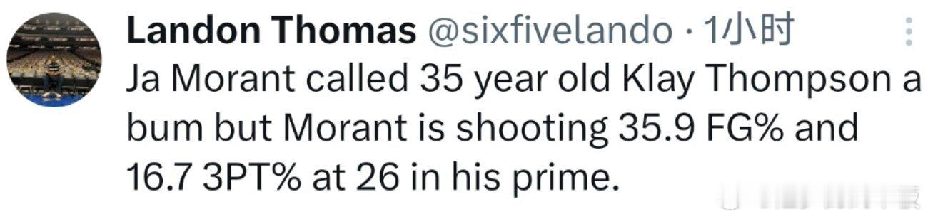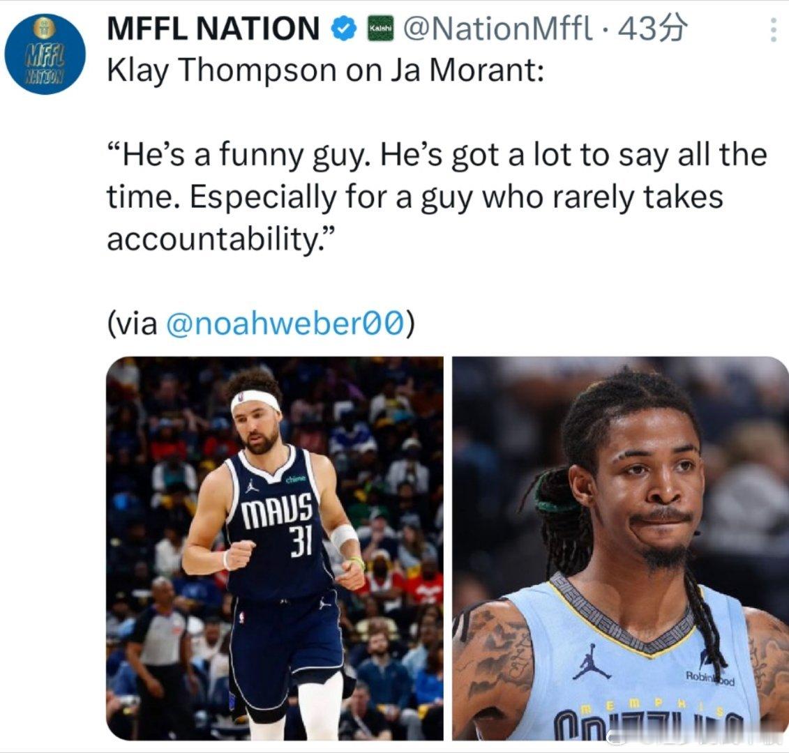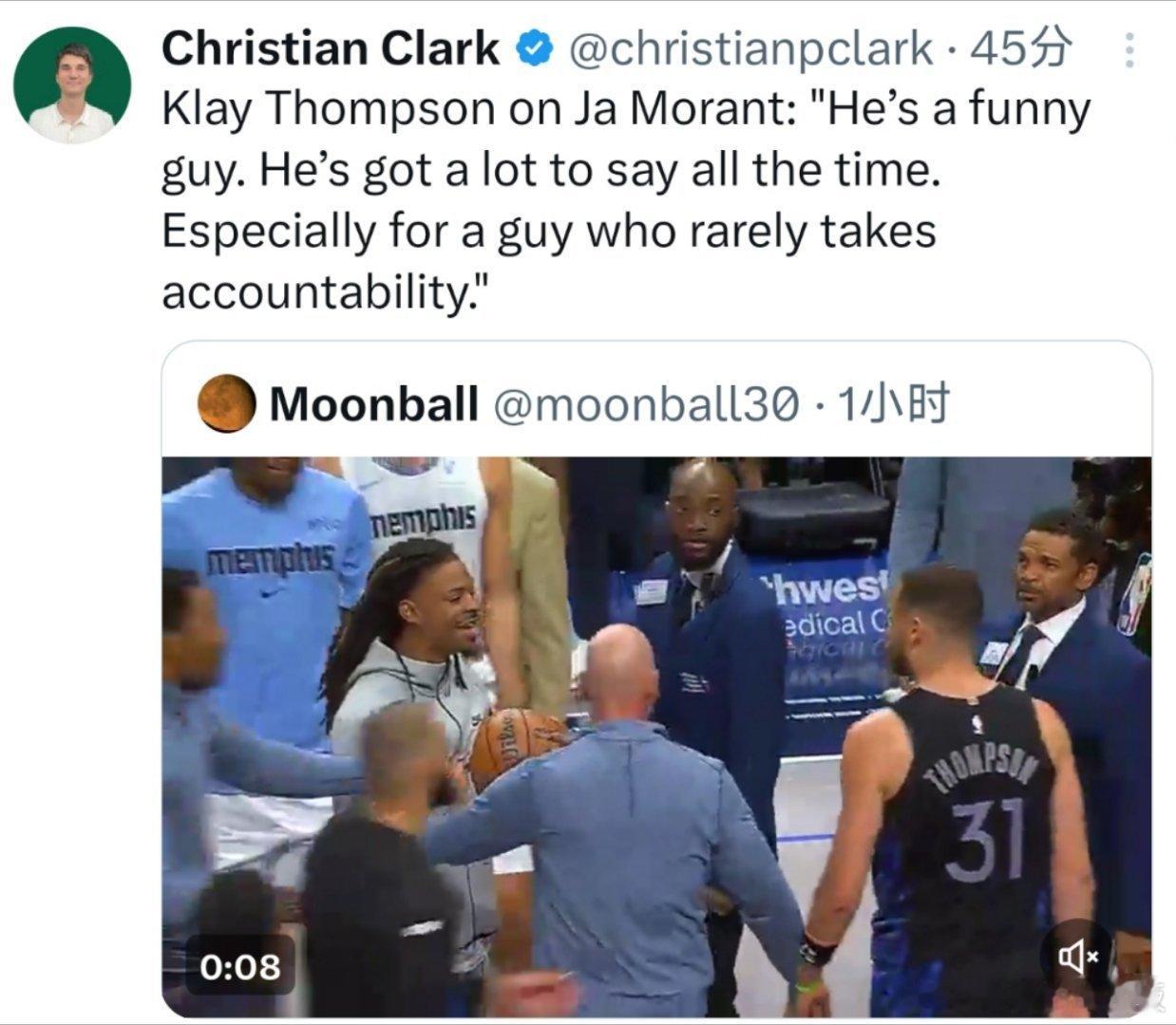 独行侠记者怒怼莫兰特:“莫兰特说35岁的克莱是个废物。但莫兰特自己才26岁,正值巅峰的他本赛季投篮命中率只有35.9%,三分命中率16.7%。”其他独行侠记者和自媒体也分别转发克莱的赛后发言