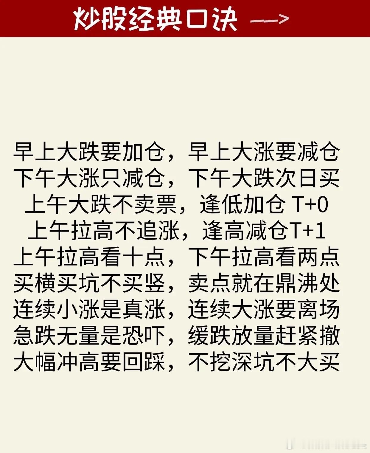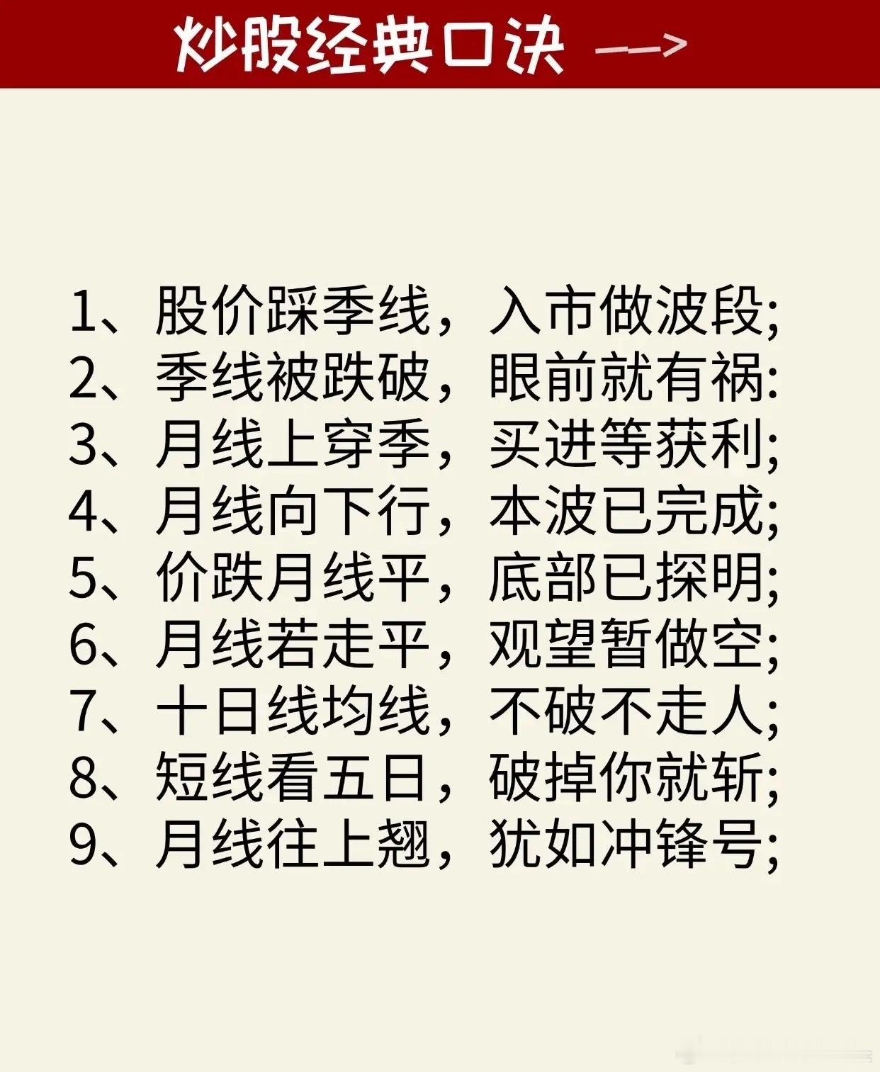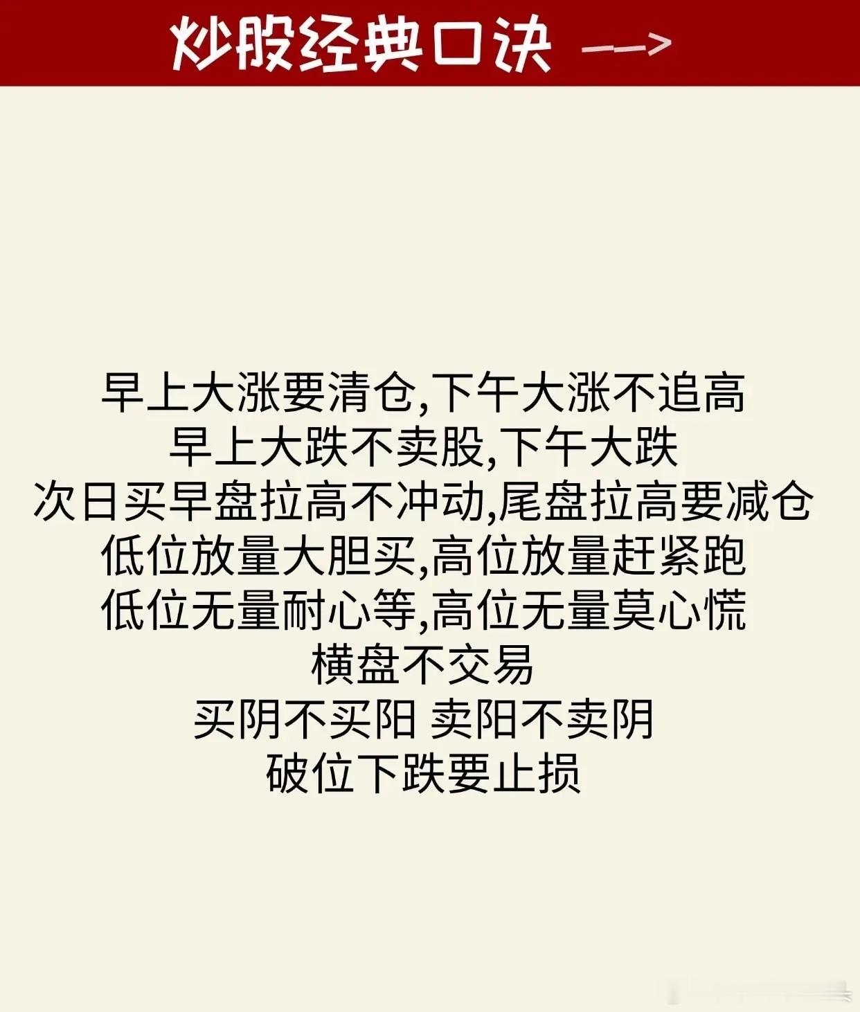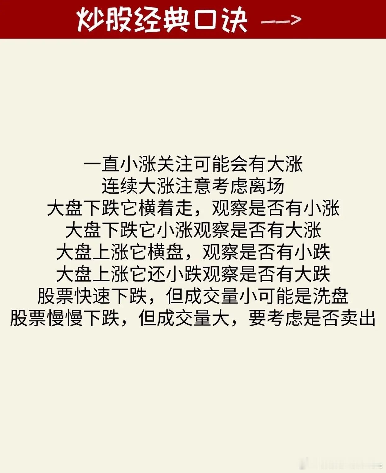 炒股相关的经典口诀汇总,内容聚焦于通过简明扼要的口诀形式,帮助股民掌握量价关系、买卖时机、趋势判断及风险应对等核心投资技巧。具体口诀内容可分为以下几类:1. 量价关系与操作建议(如第2张图):涵盖“量增价升、一定进场”“量增价平、高位走人”“量增价跌、走为上策”等13条,总结成交量与价格同步或背离时的典型操作方向(如放量上涨可入场、放量下跌需离场等)。2. 日内交易时段策略(如第3张图):针对早/下午盘不同走势给出具体建议,例如“早上大跌要加仓,早上大涨要减仓”“下午大涨只减仓,下午大跌次日买”“上午拉高不追涨,逢高减仓T+1”等,强调利用时段波动优化操作节奏。3. 关键均线参考规则(如第4张图):围绕季线、月线等中长期均线制定买卖依据,如“股价踩季线,入市做波段”“月线上穿季,买进等获利”“月线若走平,观望暂做空”“十日线均线,不破不走人”“短线看五日,破掉你就斩”等,突出均线对趋势判断的支撑作用。4. 交易时机与仓位管理(如第5张图):包含“早上大涨要清仓,下午大涨不追高”“早上大跌不卖股,下午大跌次日买”“低位放量大胆买,高位放量赶紧跑”“买阴不买阳,卖阳不卖阴”“破位下跌要止损”等,聚焦买卖时点选择(如高低位放量对应操作)、避免追涨杀跌及止损纪律。5. 趋势状态与应对策略(如第6张图):针对不同市场表现(如小涨、大涨、横盘、下跌)提出观察方向,例如“一直小涨关注可能会有大涨”“连续大涨注意考虑离场”“大盘下跌它横着走,观察是否有小涨”“股票快速下跌但成交量小可能是洗盘”“股票慢慢下跌但成交量大,要考虑是否卖出”等,强调通过趋势特征预判后续走势并调整策略。所有内容均以通俗易懂的口诀形式呈现,辅以简洁排版和清晰分类,旨在帮助投资者快速记忆并应用基础炒股技巧,同时始终贯穿风险提示,强调理性投资。