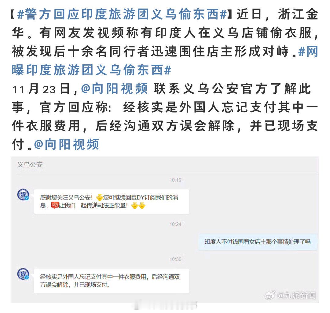 官方回应昨天热搜上义乌疑似印度人偷衣服事件,称是印度人忘记付钱了产生的误会,并非偷窃。