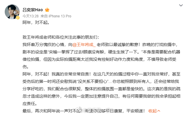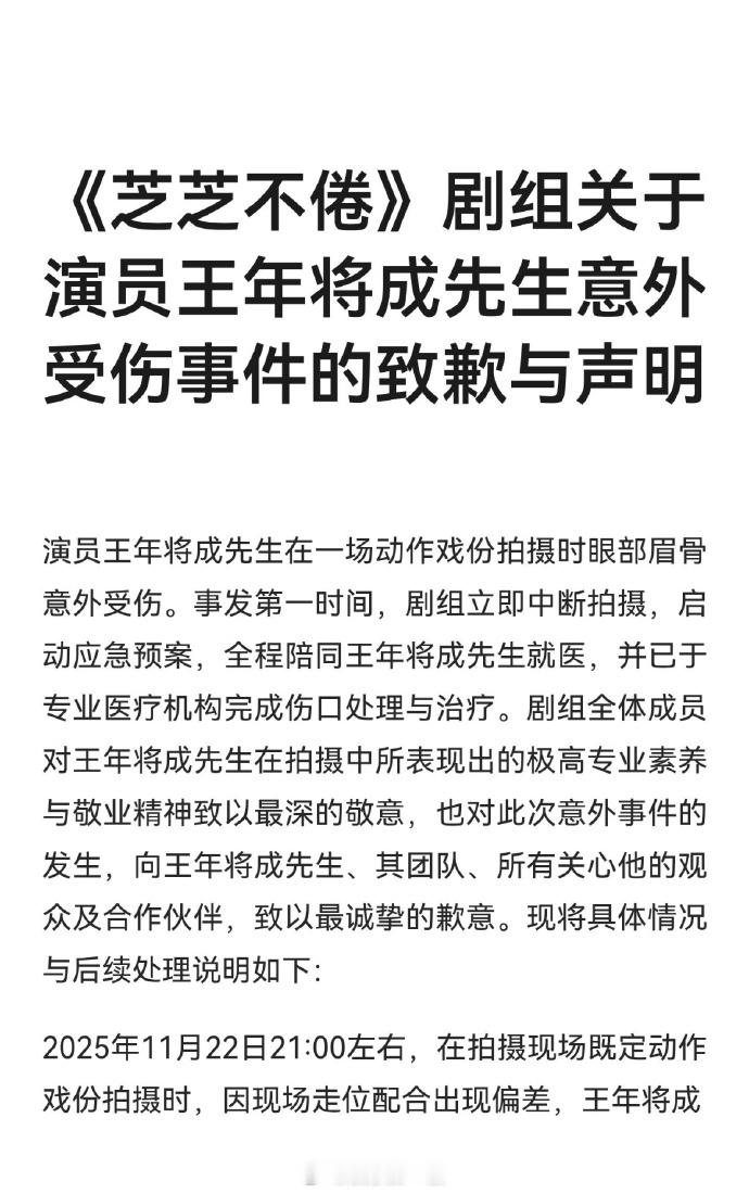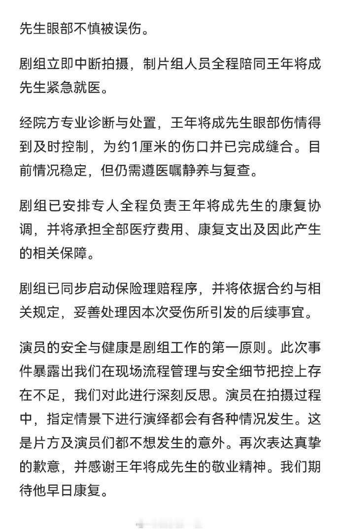 向 道歉:“本身是需要配合机器借位拍摄,但因为实际拍摄距离太近我没有控制好动作力度和角度,不慎导致老师受伤。”“阿年,对不起!我真的非常非常自责!”此外,该短剧剧组也回应,称因现场走位配合出现偏差,王年将成眼部不慎被误伤。紧急就医后,王年将成先生眼部伤情得到及时控制,约1厘米的伤口已完成缝合。