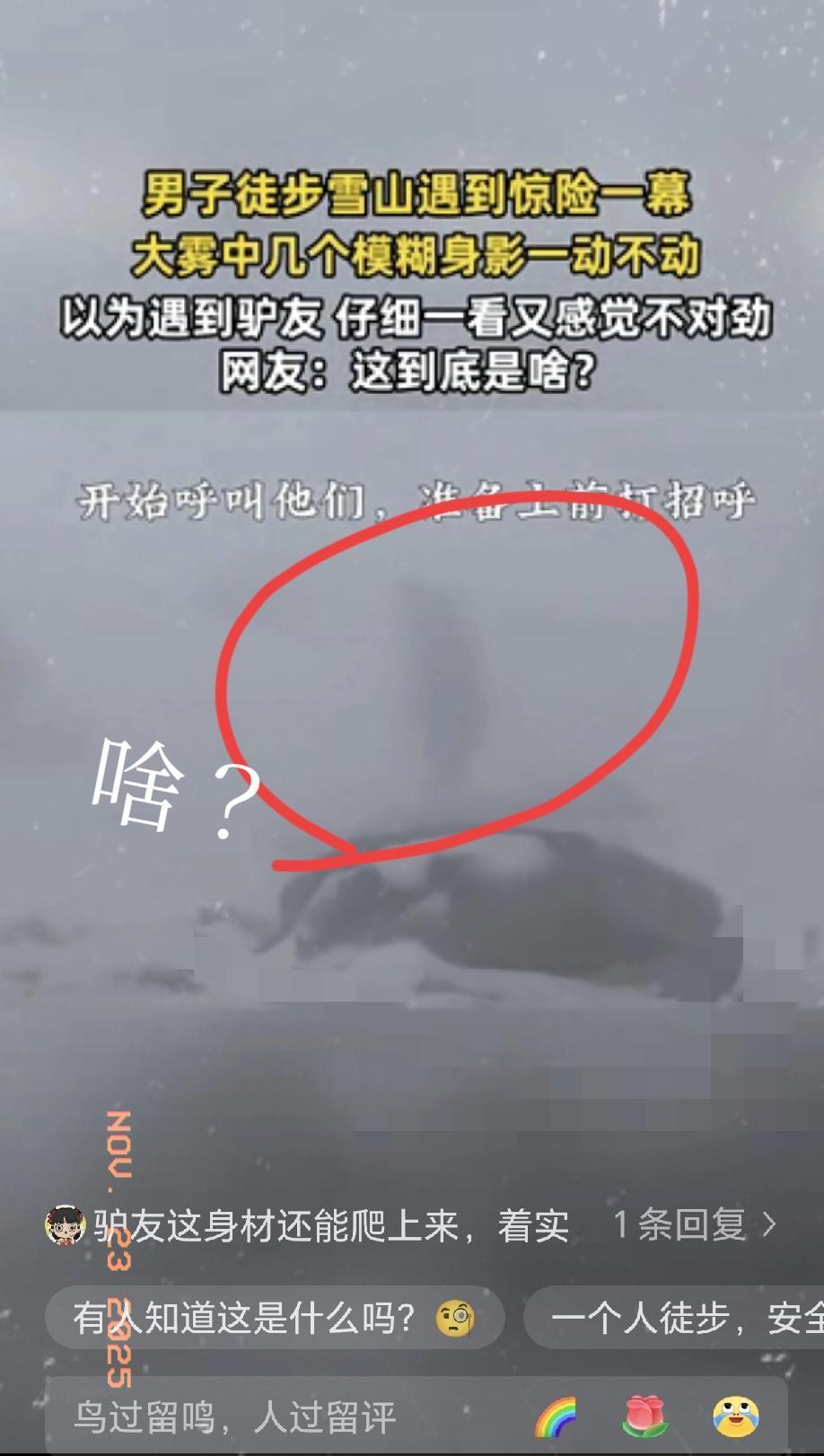 “解释不清了!”云南,一男子徒步爬雪山,恰巧遇到大雾天气,不料,男子发现前方突然出现了几个模糊身影一动不动,男子以为遇到了“驴友”,仔细一看吓一大跳!网友:“这到底是什么?” 光看描述都起鸡皮疙瘩!独自在大雾雪山里撞见“不动人影”,换谁都得慌,这根本不是胆子大小的问题,而是未知和环境烘托出的本能恐惧。 网友猜马面熊的确实有点吓人,但更多是主观脑补——雪山里被雪覆盖的石头、枯树桩,在雾里看真的容易“变样”,视觉错觉才是幕后黑手。 徒步的核心是享受风景,不是赌运气!雾天能见度低,别说认不清物体,连路线都容易走偏,喊几声没回应就该及时止损,千万别好奇凑近。 户外安全永远是第一位,比起纠结“到底是什么”,提前做好防护、学会判断风险才更重要。你有没有在户外遇到过让你瞬间头皮发麻的视觉错觉?