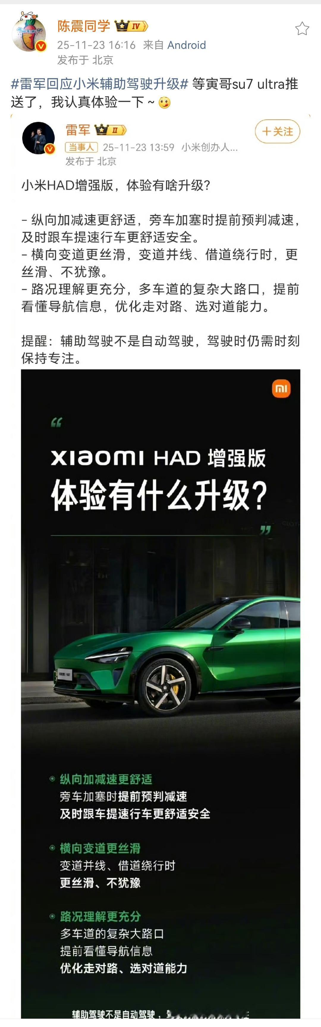 陈震:雷军回应小米辅助驾驶升级 等寅哥su7 ultra推送了,我认真体验一下~[狗头] 雷总这一次不仅着重介绍了小米有哪些升级的重点,而且还特意提醒了辅助驾驶不是自动驾驶,驾驶时仍然需要保持时刻专注。 最近小米在宣传上对很多宣传词进行了更改,并在一些关键项目上进行了着重的强调,特别是在安全方面,最近小米宣传的非常的多。 包括此次辅助驾驶软件的重大升级,主要也是在安全上进行重大的升级。能主动应对多种可能会发生的潜在碰撞风险,降低发生交通事故概率。 各位是怎么看的?欢迎评论区留言。
