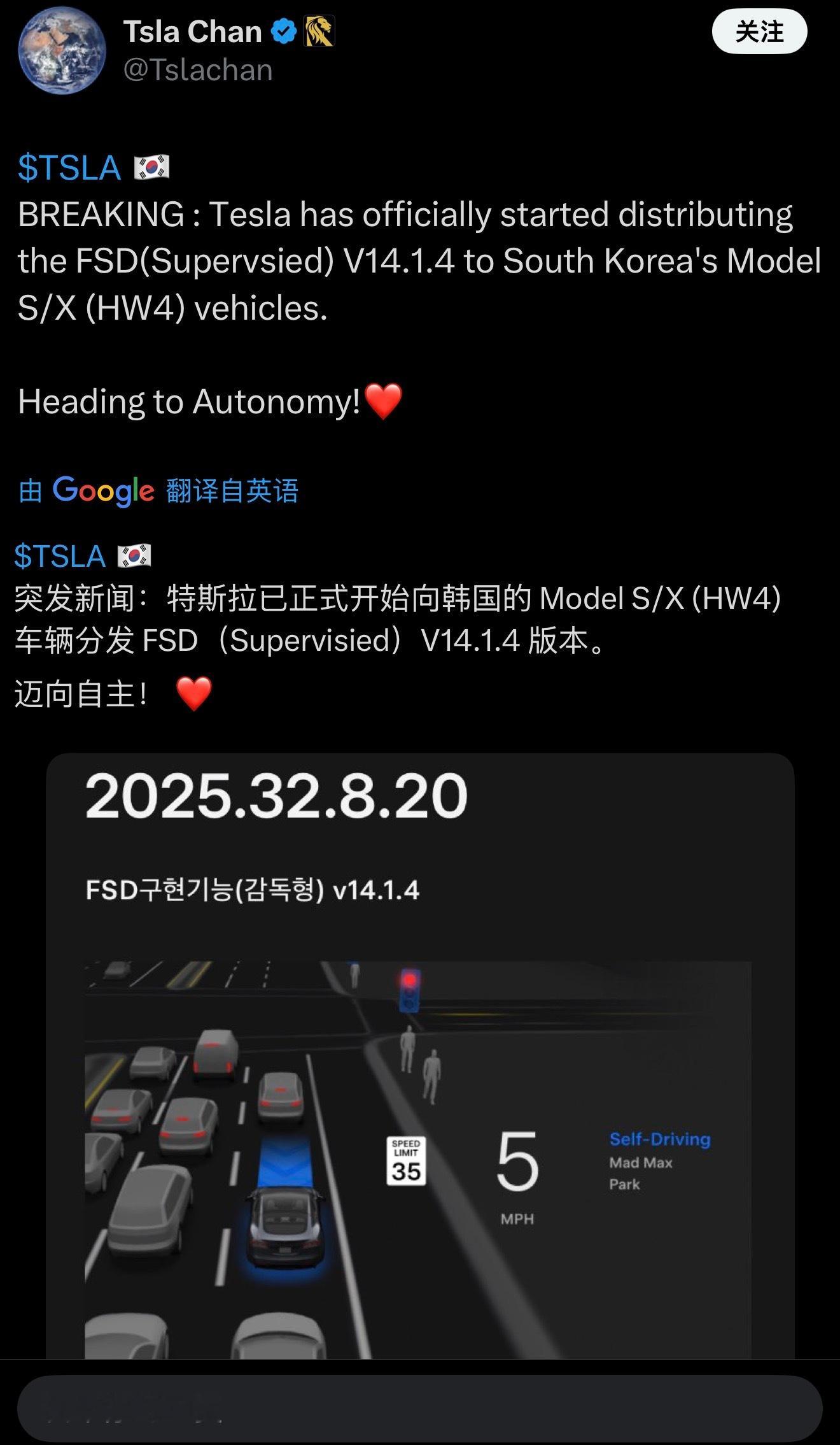 特斯拉给韩国的ModelS/X(HW4)推送了FSD14.1.4。
