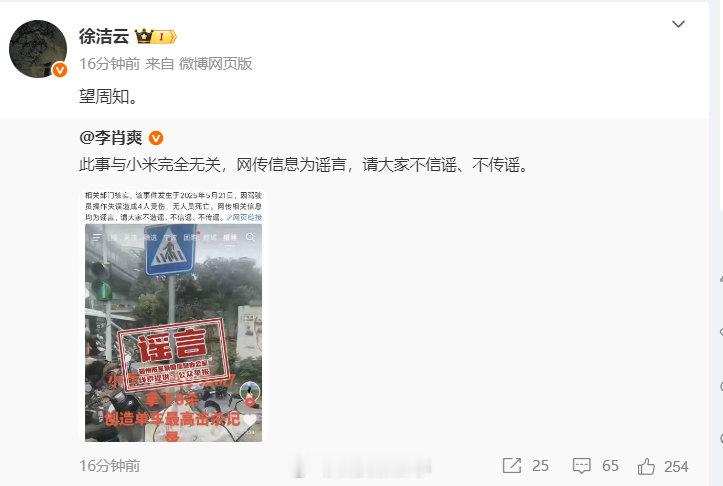 11月23日,小米高管 、 转发 博文,表示网传小米汽车在小乔地铁站致人死亡等事件与小米无关。李肖爽表示:此事与小米完全无关,网传信息为谣言,请大家不信谣、不传谣。