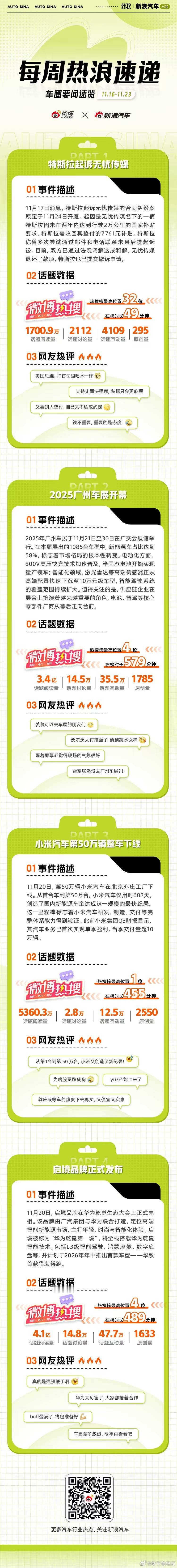 本周车圈热点不断:特斯拉起诉无忧传媒,目前已通过法院达成和解;2025广州车展开幕,电动化与智能化是核心看点;小米汽车第50万辆整车下线,提前完成年度35万辆交付目标;启境品牌正式发布,计划2026年年中推出首款车型。